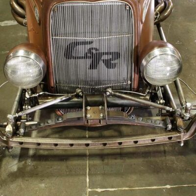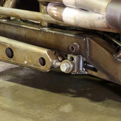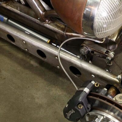 The front suspension is Brown’s own creation; it looks like a traditional spring-over hot rod setup at first glance, but then you notice the cantilevered shocks and pass-throughs in the radius arms for the steering linkage.