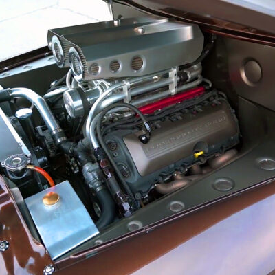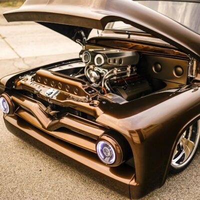 The F-100 is powered by a Ford 302 cubic-inch, 5.0-liter small-block Coyote V8 engine with Kenne Bell Mammoth 3.2LC Liquid Cooled supercharger on top, and is mated to a four-speed Ford 4R70W automatic transmission with overdrive.