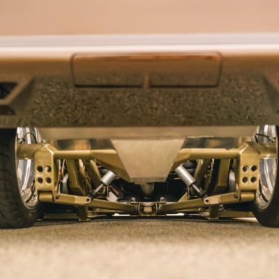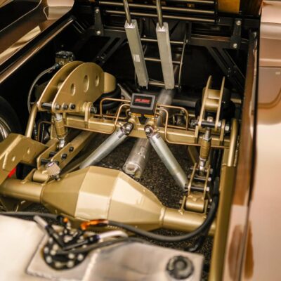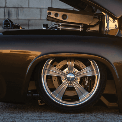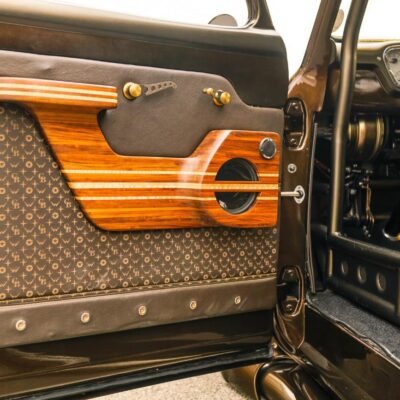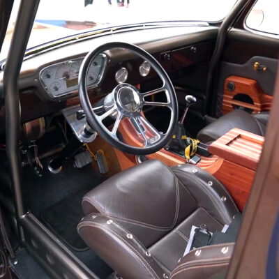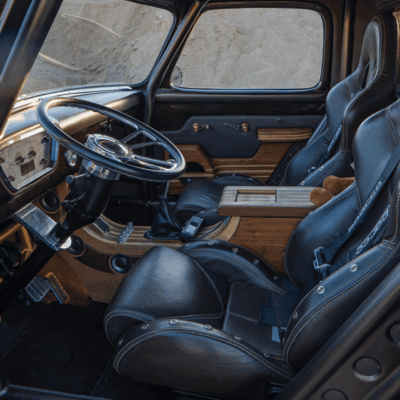 Lukasz crafted a four-point reinforced roll cage and stuck with the performance theme by incorporating leather covered Sparco racing seats expertly wrapped by Santos Upholstery. Black walnut and curly maple adorns the cab in the form of a custom center console and door panels that house audio gear and the AccuAir e-Level controller. Oneoff “CB” (for owner Chris Beatty) monogrammed material wraps the door panel and headliner for a subtle, personalized touch.