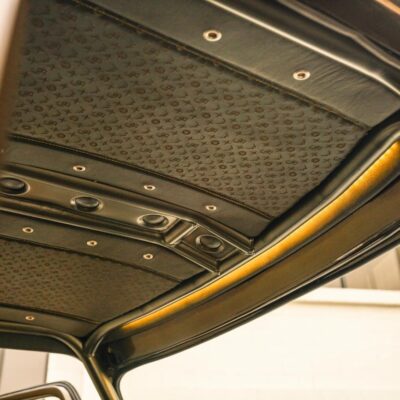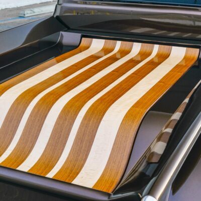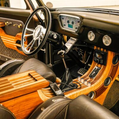 Aside from shaving some necessities from the truck’s surface—door handles, rain gutters, vents and emblems—there really hasn’t been much added to the façade. The front grille received a pretty radical restyling, as did the rear, with its molded tailgate and Chevrolet Cobalt taillights frenched into the rear fenders. The real shining beacon on the Ford’s exterior, however, is the amazing bed floor. The contoured bed floor not only features a luxurious combination of walnut and maple, but the entire floor lifts up via actuator, exposing the powder-coated frame and chassis components. Lukasz wanted to create a one-off bed in the past, and the F-100 was the ideal opportunity to pull out all the stops.