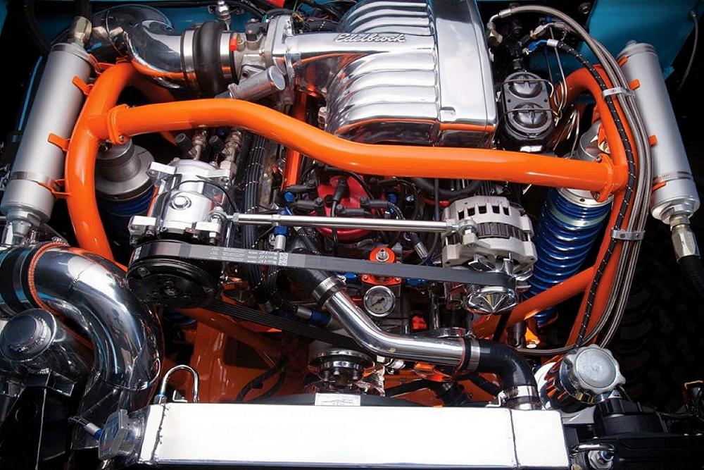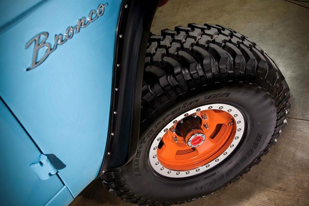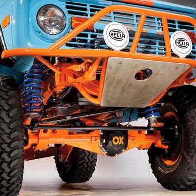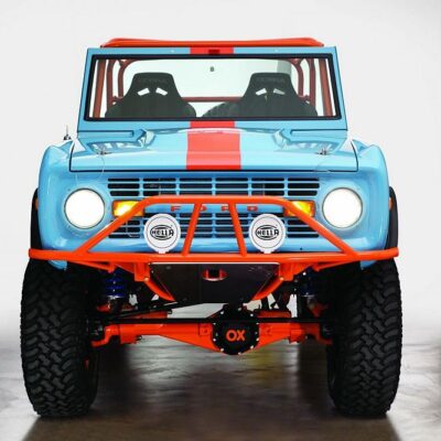 This Galpin Auto Sports 1966 Ford Bronco is a 540 horsepower offroad monster, powered by a 377 cubic-inch Ford stroker V8. The powerplant is fed by a custom tuned Edelbrock EFI system and sends its power through a Ford AOD (Automatic Over-Drive) transmission.
