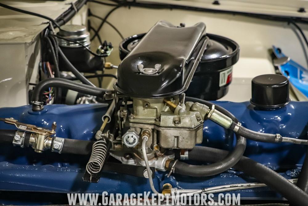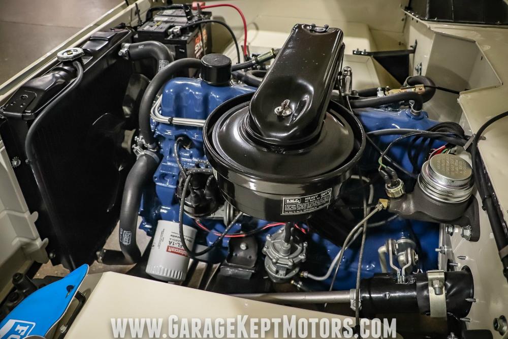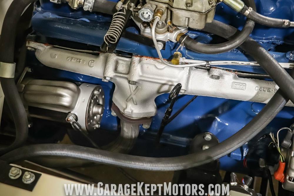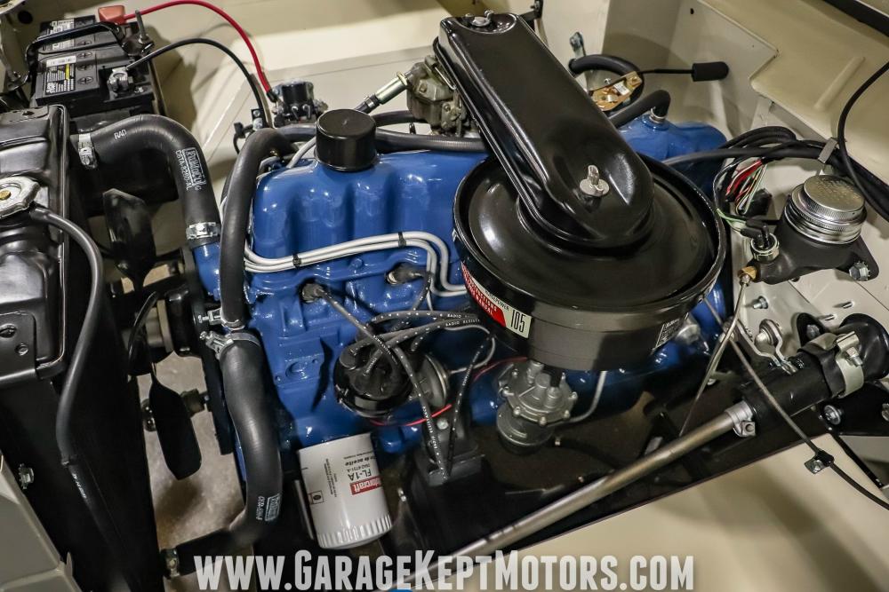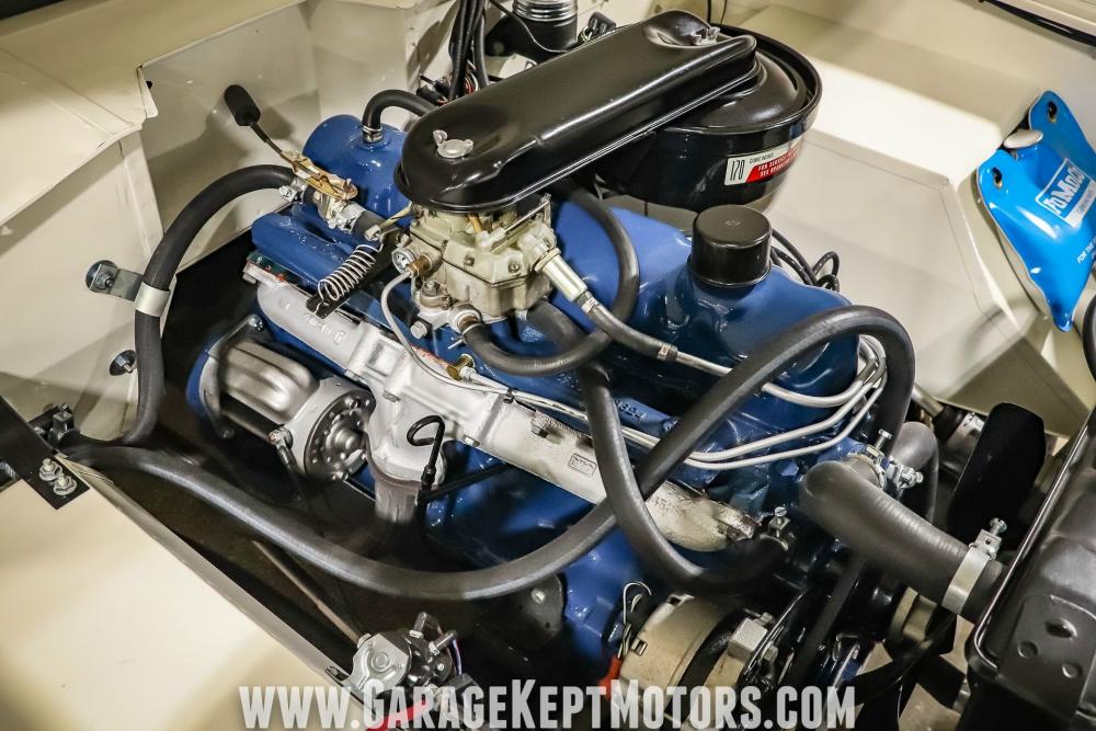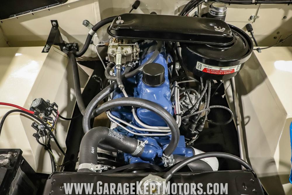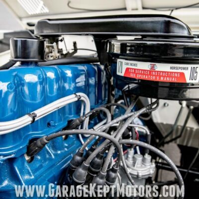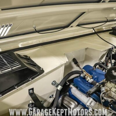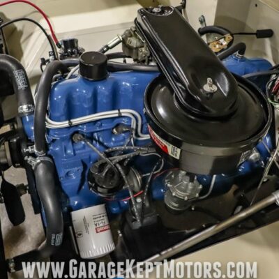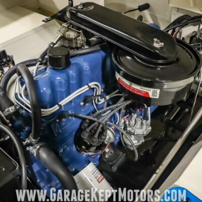 The engine was bored .040” over with new pistons; the crank was re-ground, and the head was completely rebuilt with new valves. The following items are new on the engine and transmission assembly: clutch kit; radiator; alternator; starter; voltage regulator; starter solenoid; engine gaskets; rebuilt carburetor; water pump; oil pump; timing chain; thermostat; “Ford” engine hoses; “Ford” battery cables; rebuilt distributor with igniter insert replacing points. Every fastener was cleaned, stripped, and re-coated before reassembly. Every bracket and rebuilt component were sandblasted and powder-coated or repainted. All fasteners and small components have been zinc re-coated by a local vendor.