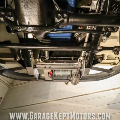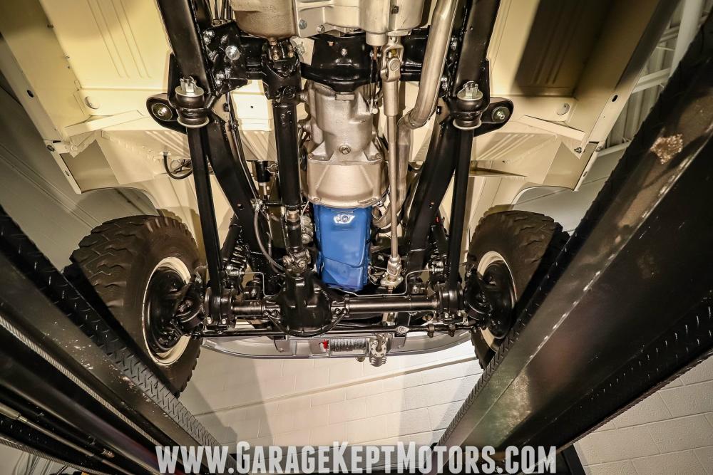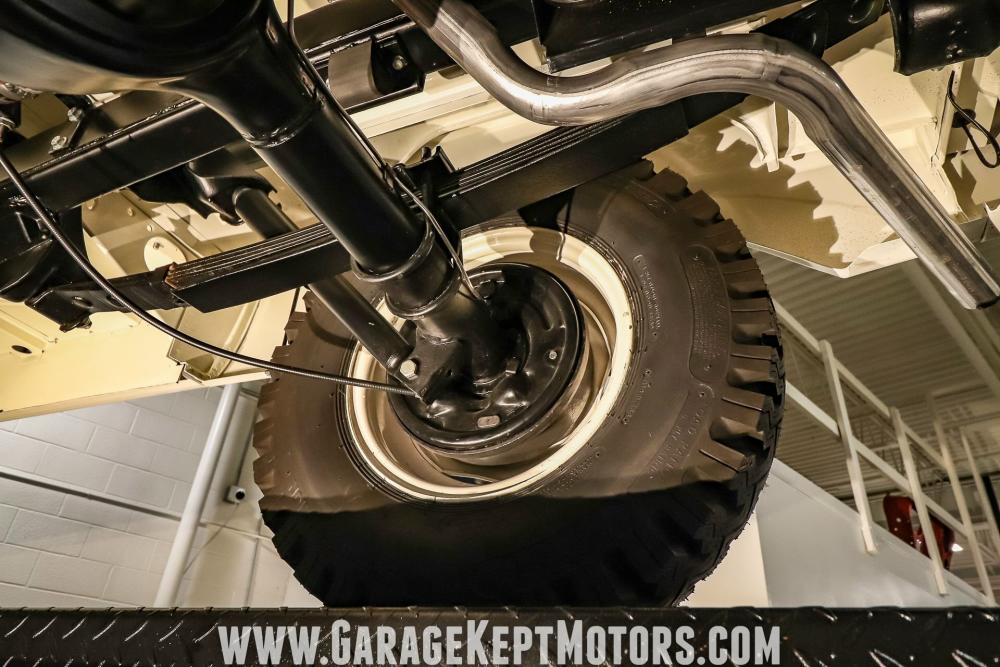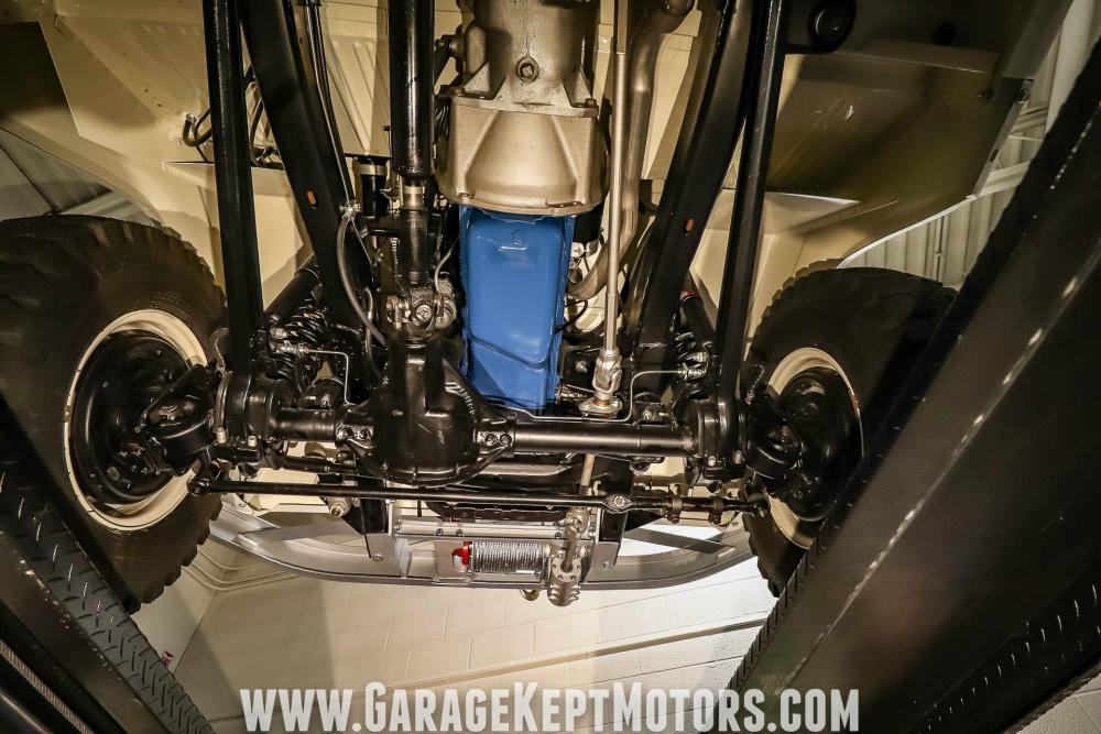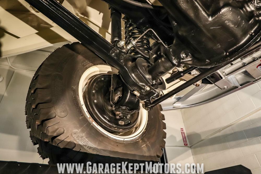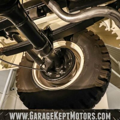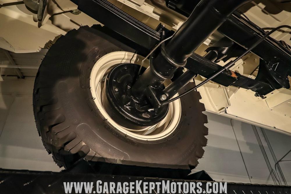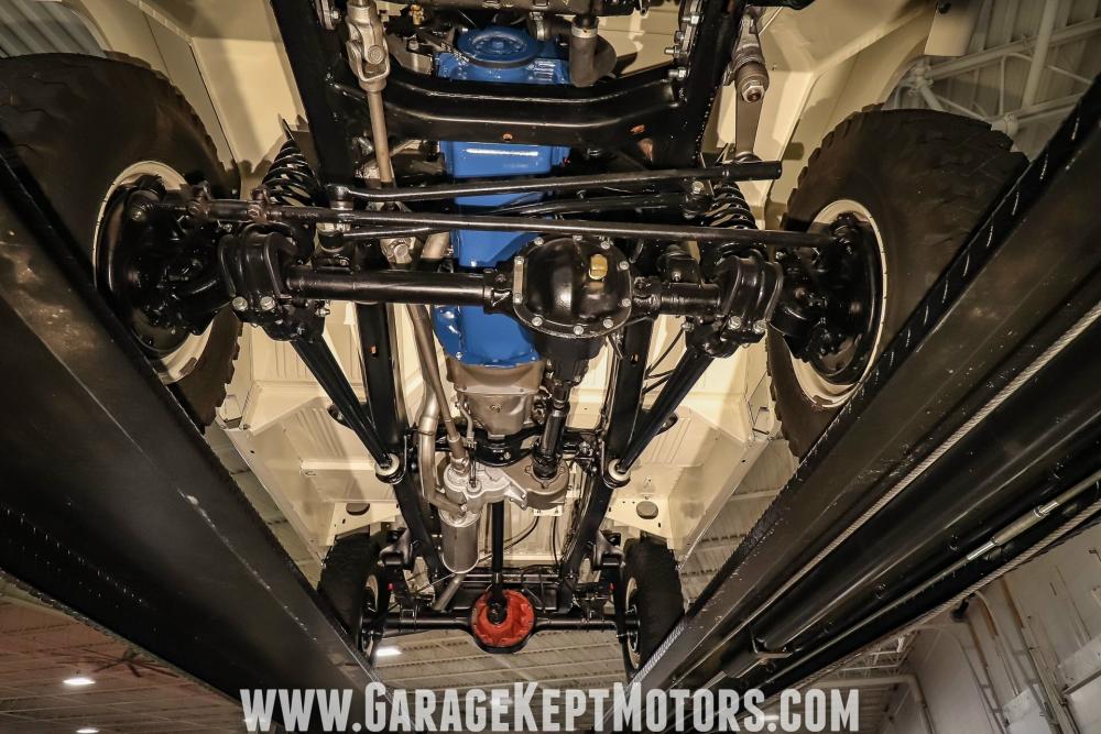 Complete disassembly and sandblasting of axles and all chassis components; axles, frame and rear springs wet-sprayed with urethane chassis paint; all other chassis components powder-coated; front and rear axles, transfer case and transmission inspected, and new seals and bearings installed. The following are new chassis items: drivelines front and rear; brakes front and rear; stainless steel brake lines; rubber flex lines parking brake cables; fuel lines; fuel tank; fuel-tank sending unit; fuel-tank strap; rubber bushings in the front axle; body mounts; period-correct tires mounted on correct “Ford” rims (also sand-blasted and repainted). The PTO winch was completely rebuilt including new main shaft, bearings, and seals.