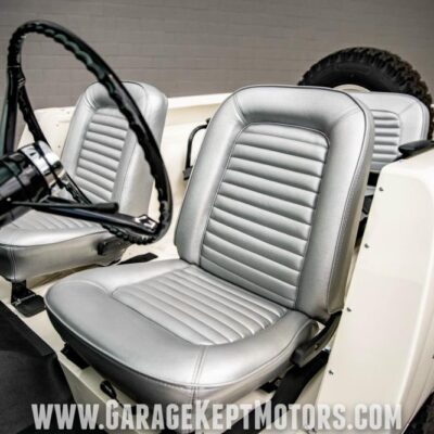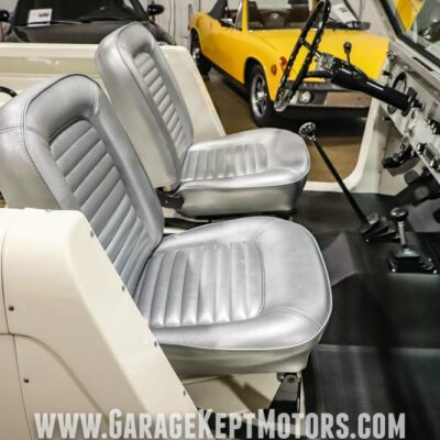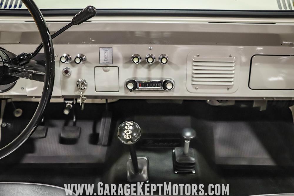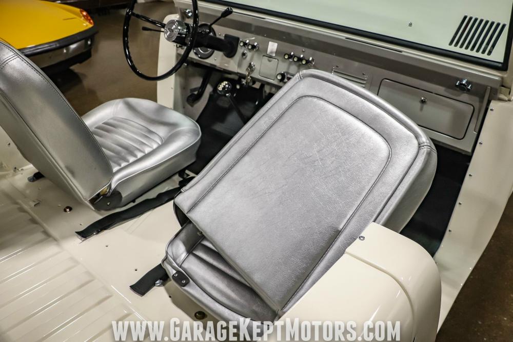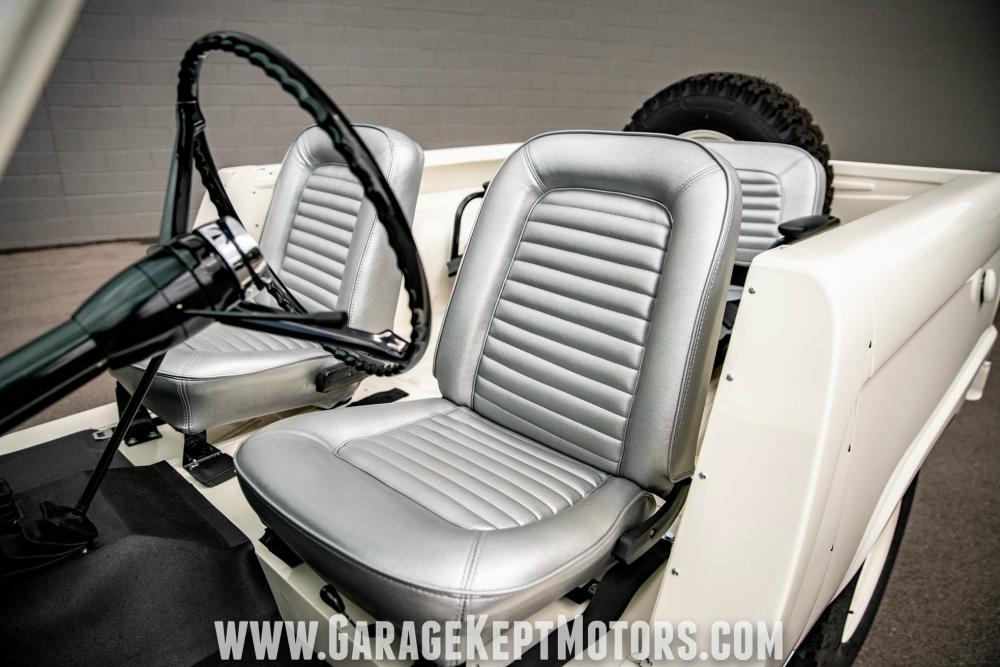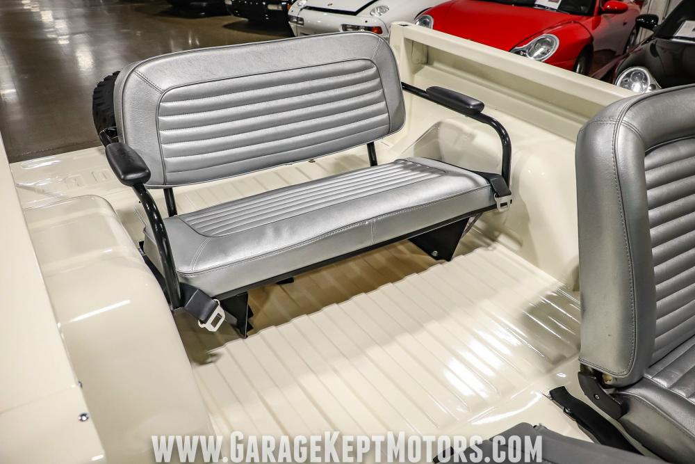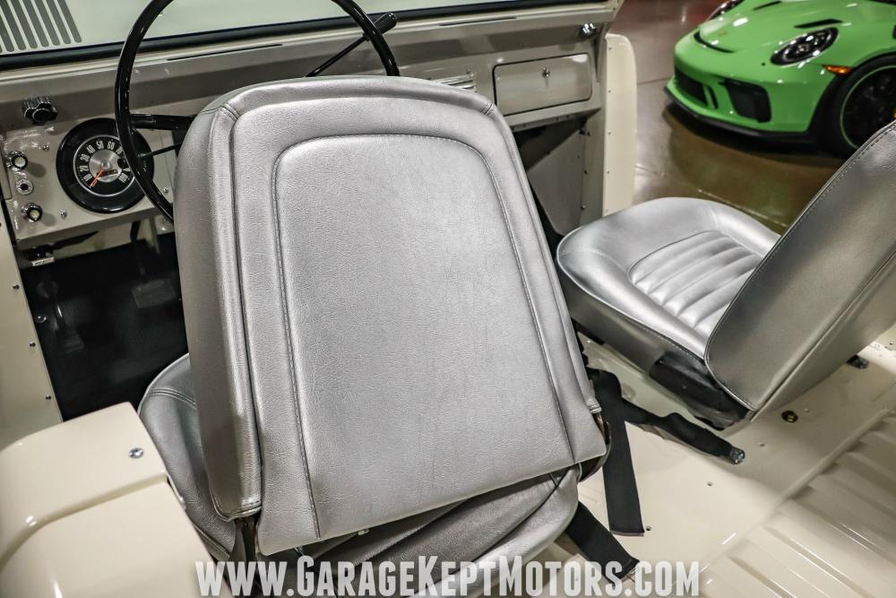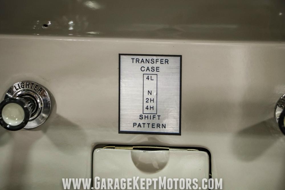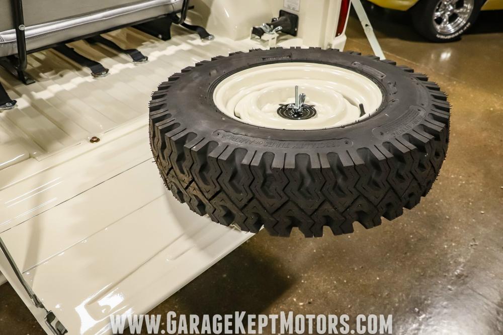 All of the following are either new or rebuilt: Fuel tank and sending unit; steering column; steering tie-rods; windshield washer bag; windshield washer pump and lines; air-box seal; floor mat; steering wheel; dash knobs and bezels; glove-box liner; front engine-bay wire harness; under-dash wire harness; dash knobs for holding the windshield frame; windshield and gasket; headlights; parking and taillight lenses; stripes and letters; seat covers, seat foam front and rear; heater box; heater ducts; transfer-case shifter knob and boots; rubber pedal pads; mirror head; alternator wire harness.