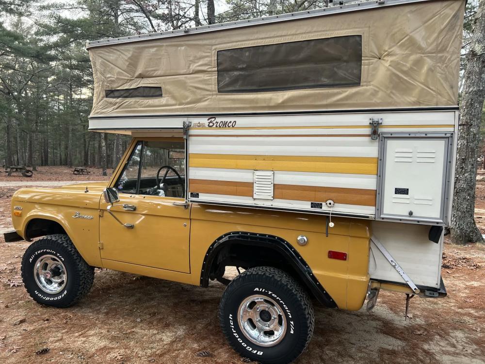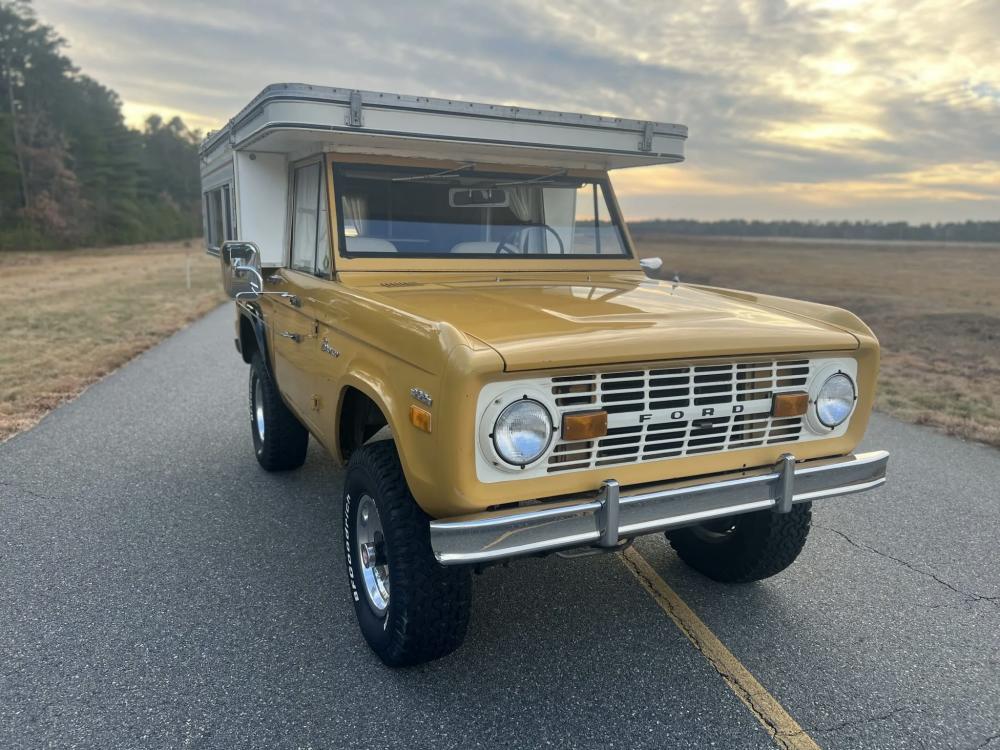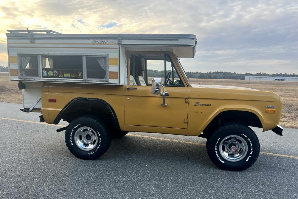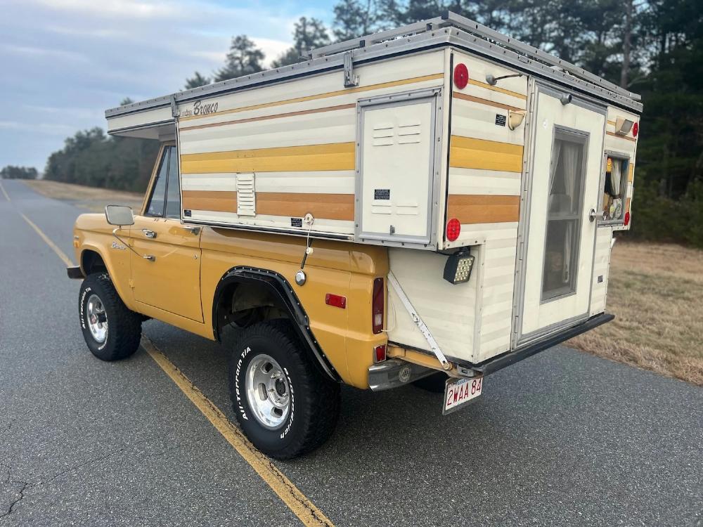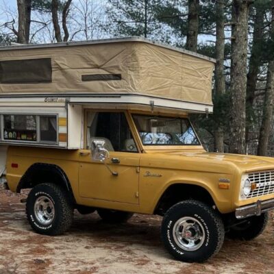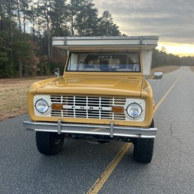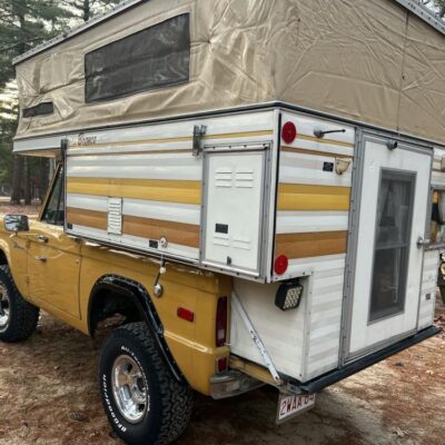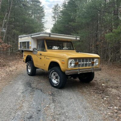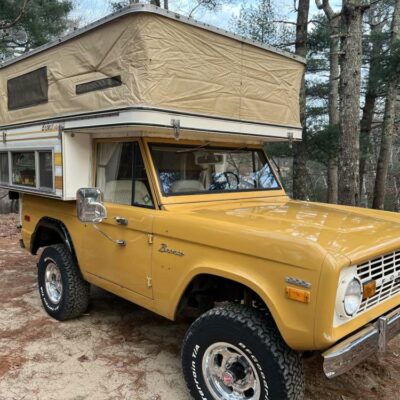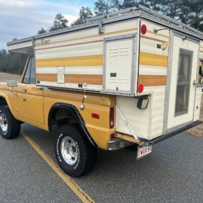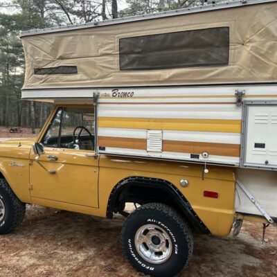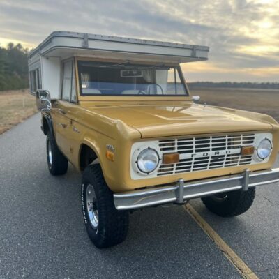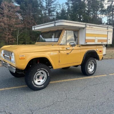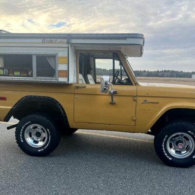 This 1971 Ford Bronco is fitted with a Four Wheel pop-up camper and powered by a 302ci V8 mated to a three-speed manual transmission and a dual-range transfer case. The camper features a couch, an over-cabin bed, storage cabinets, a dual-burner stove, a cooler, and a sink. Additional equipment includes manually locking front hubs, 15″ wheels, rear wheel-arch extensions, chrome bumpers, and a Blaupunkt AM/FM/cassette stereo.