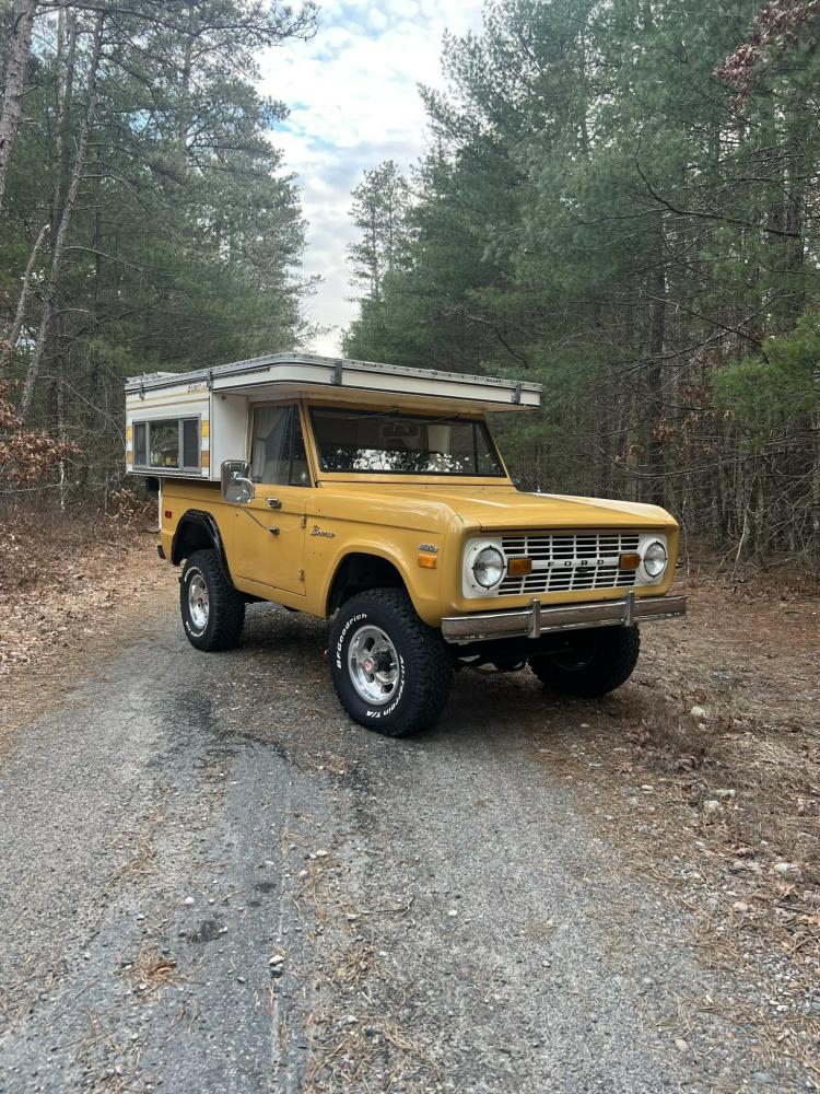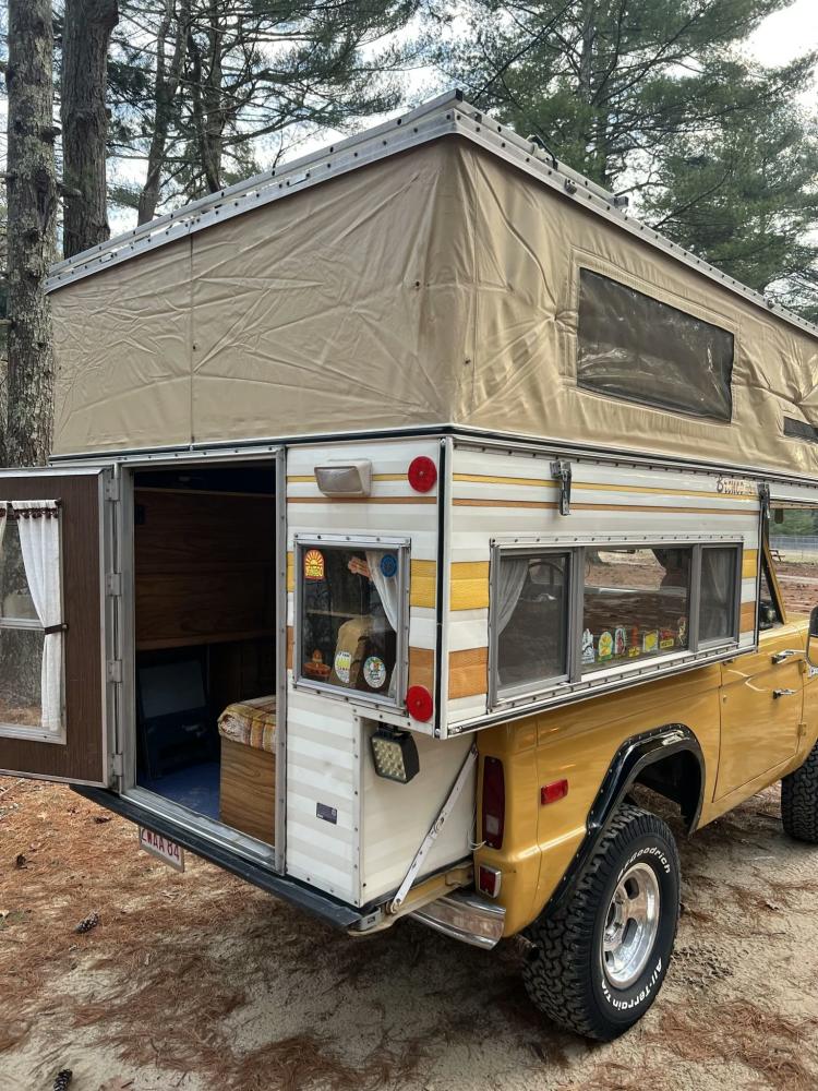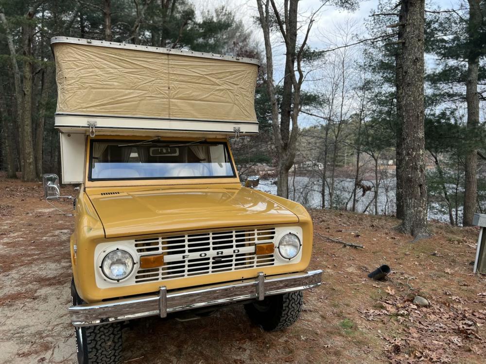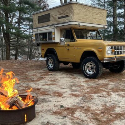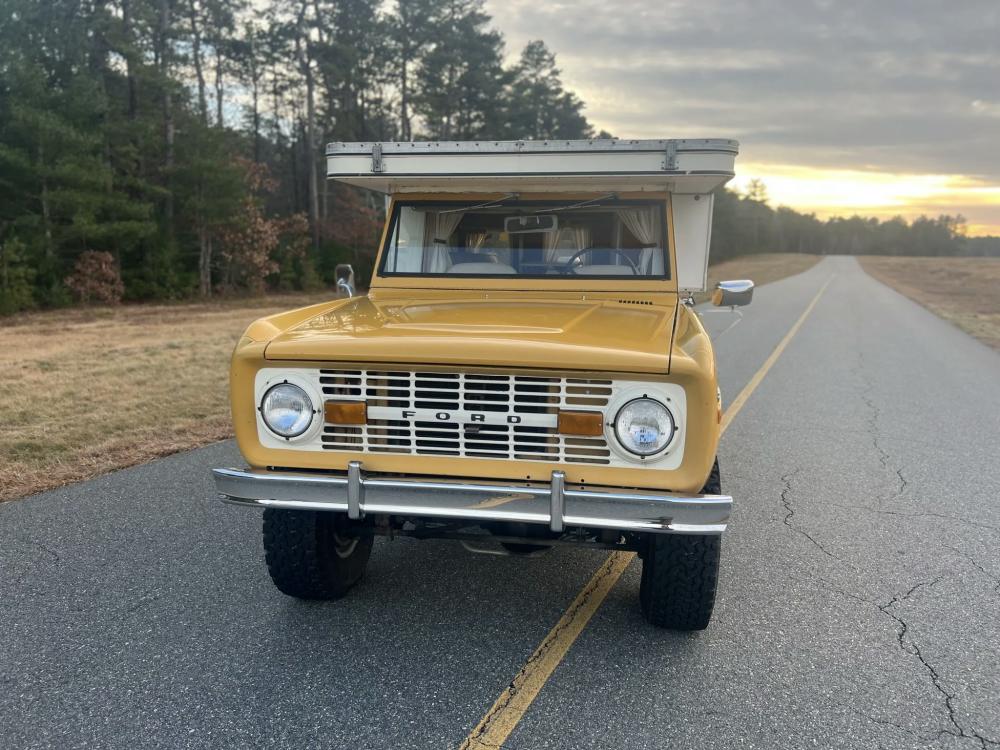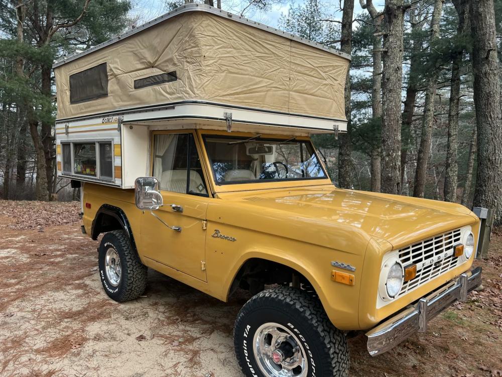 This 1971 Ford Bronco is fitted with a Four Wheel pop-up camper and powered by a 302ci V8 mated to a three-speed manual transmission and a dual-range transfer case. The camper features a couch, an over-cabin bed, storage cabinets, a dual-burner stove, a cooler, and a sink. Additional equipment includes manually locking front hubs, 15″ wheels, rear wheel-arch extensions, chrome bumpers, and a Blaupunkt AM/FM/cassette stereo.