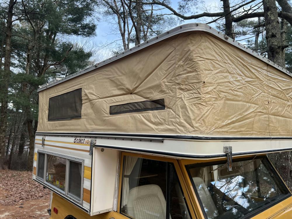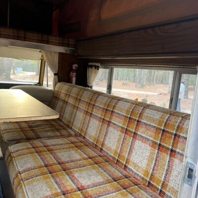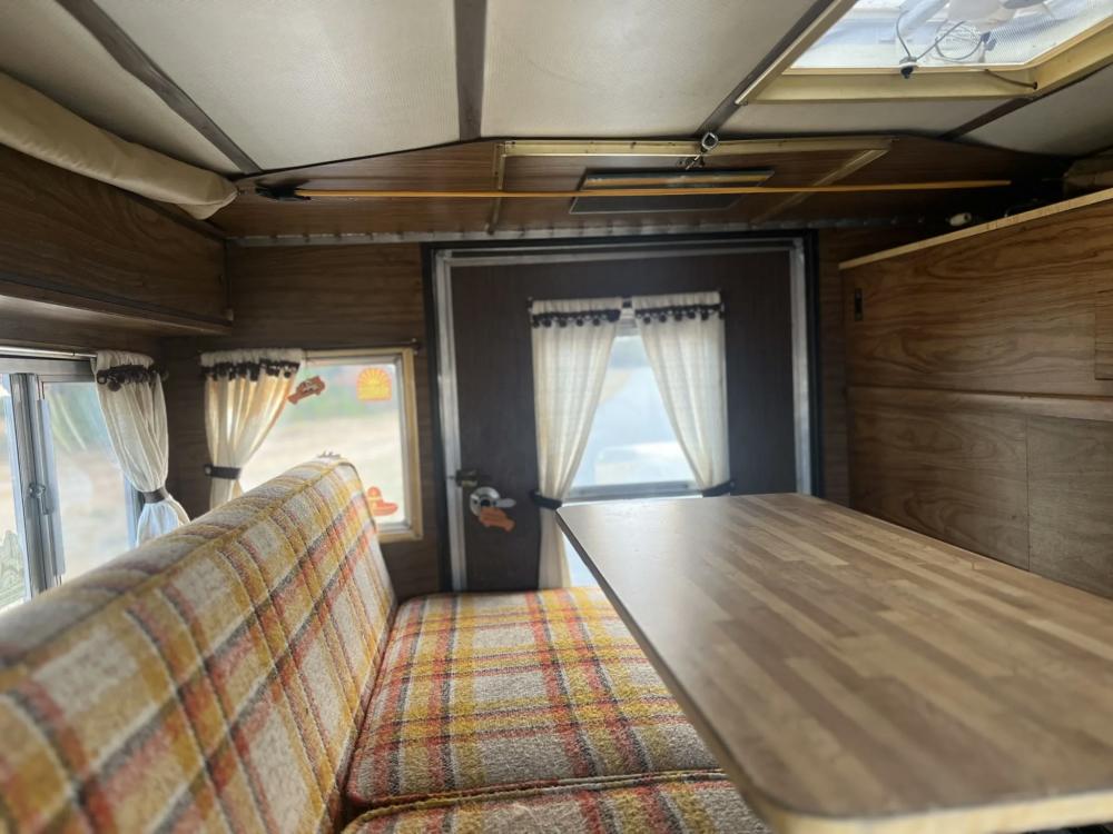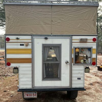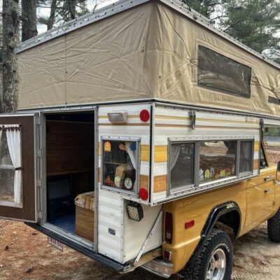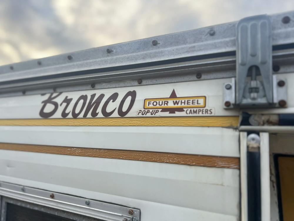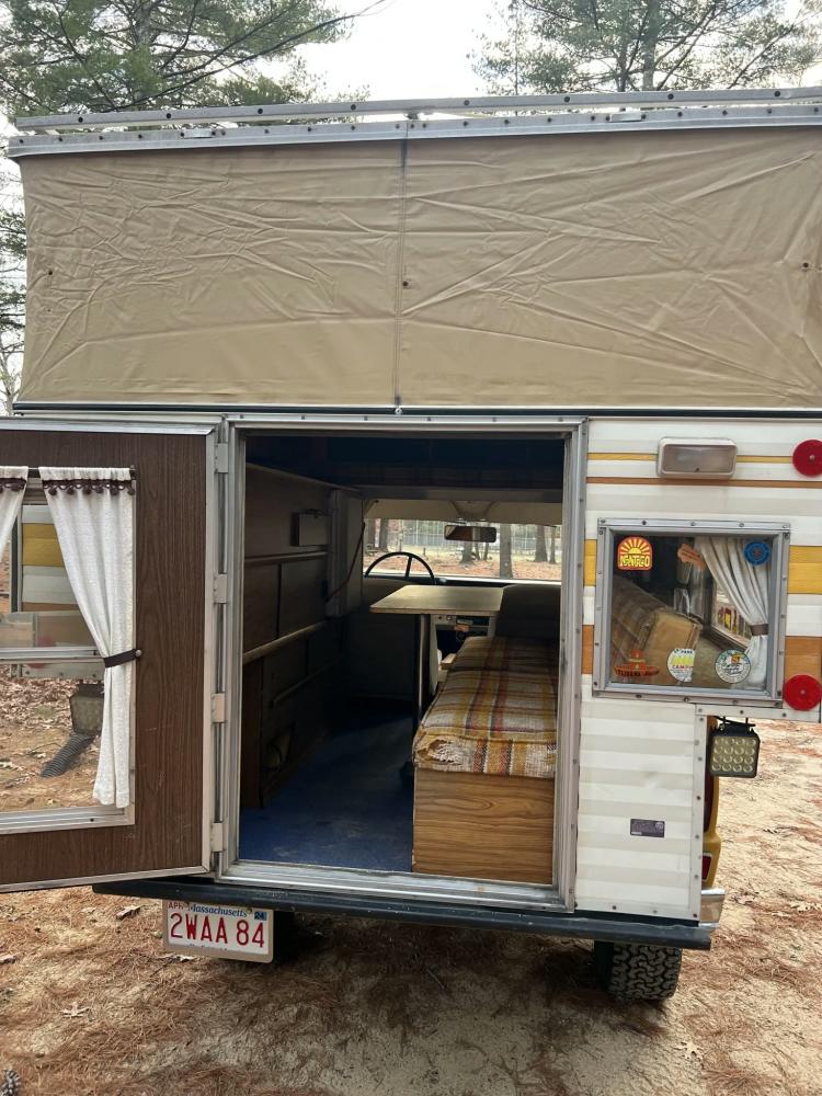 The pop-up camper was installed by Four Wheel Campers of Denver, Colorado, in June 1983. Features include an upper bed over the cabin, a plaid couch, a removable table, a curtain divider, and faux wood cabinets and floors. The kitchenette includes a cooler, a sink, and a dual-burner stove.
