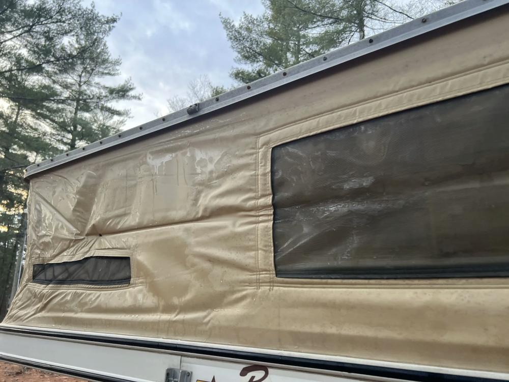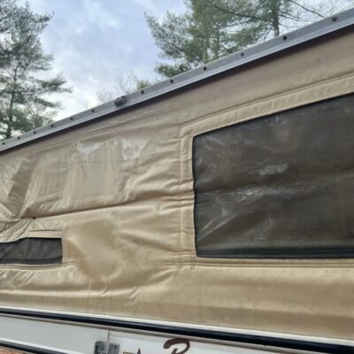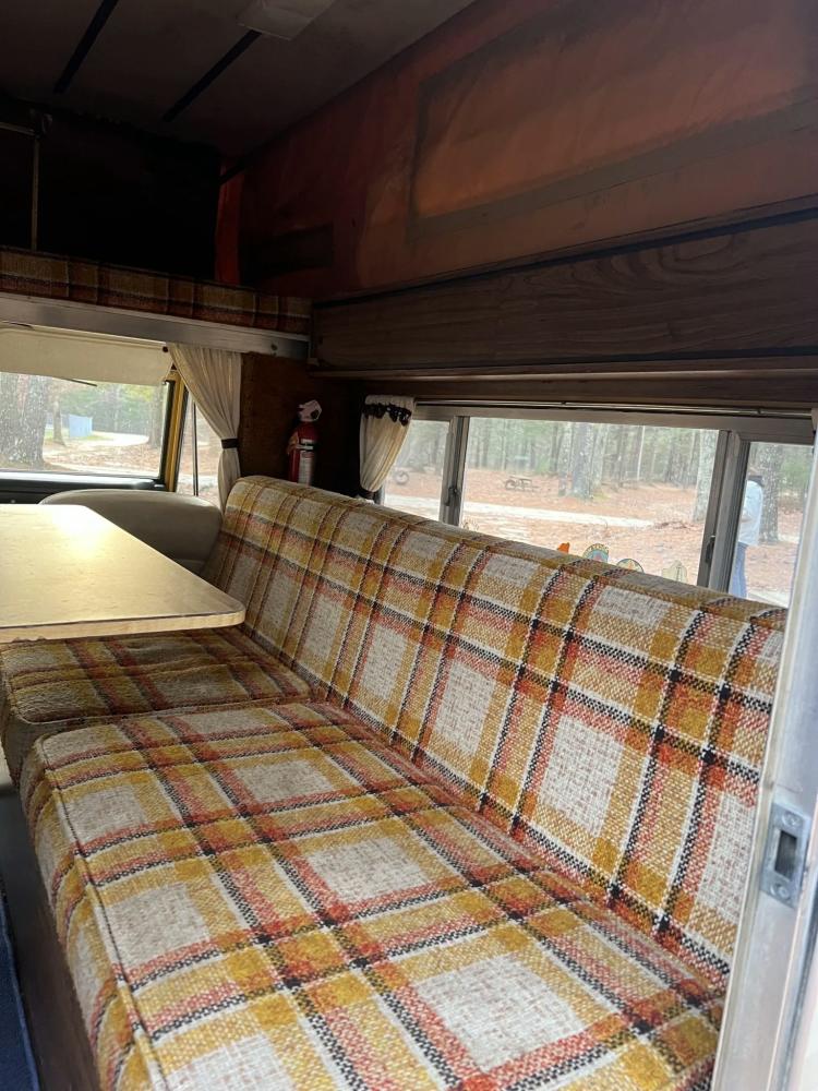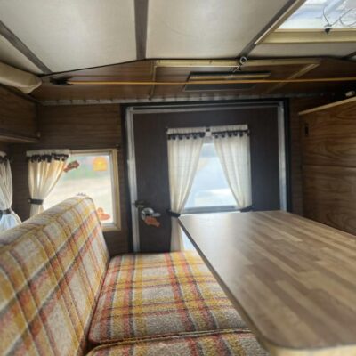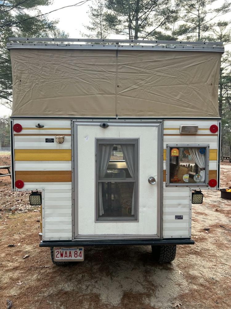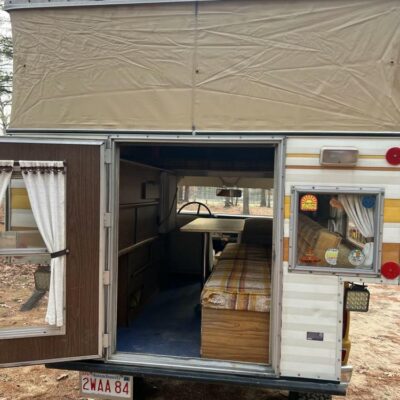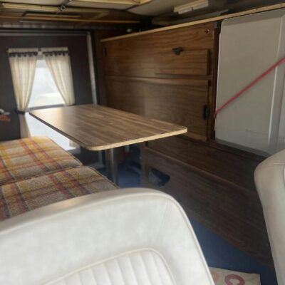 The pop-up camper was installed by Four Wheel Campers of Denver, Colorado, in June 1983. Features include an upper bed over the cabin, a plaid couch, a removable table, a curtain divider, and faux wood cabinets and floors. The kitchenette includes a cooler, a sink, and a dual-burner stove.