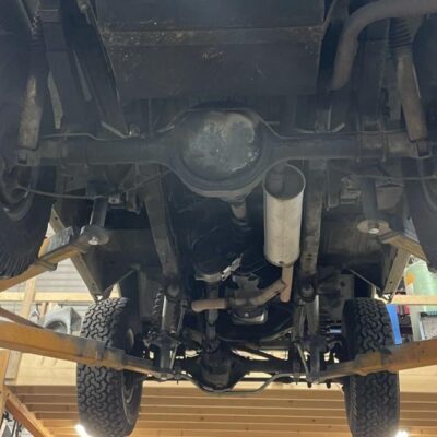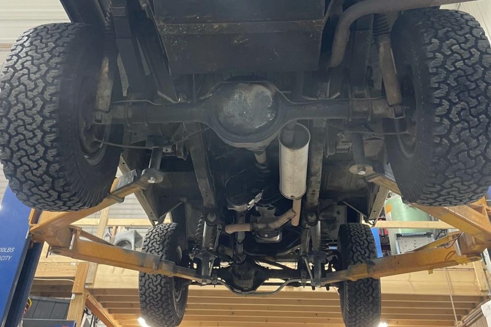 Five-hole 15″ wheels are mounted with 31×10.5″ BFGoodrich All-Terrain tires showing 2009 date codes. The front axle is fitted with manual locking hubs, and braking is handled by four-wheel drums.