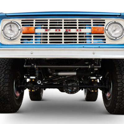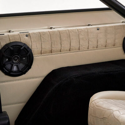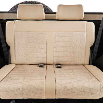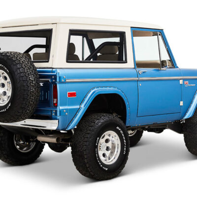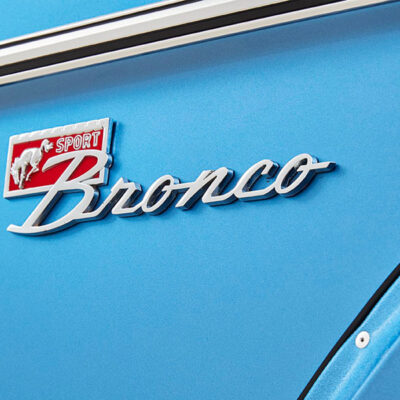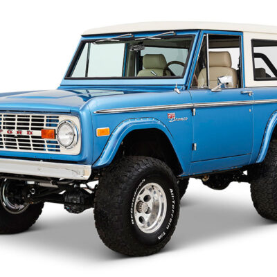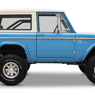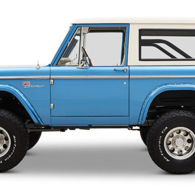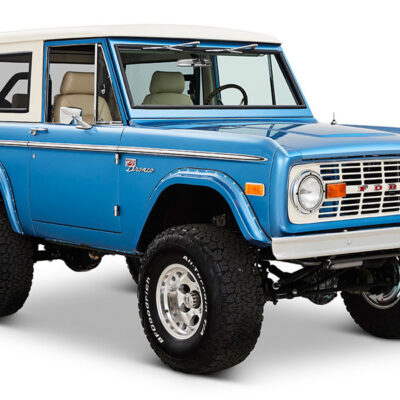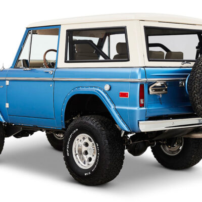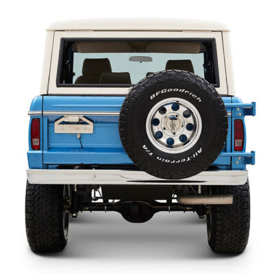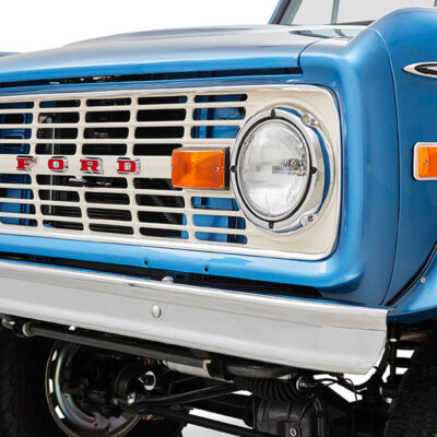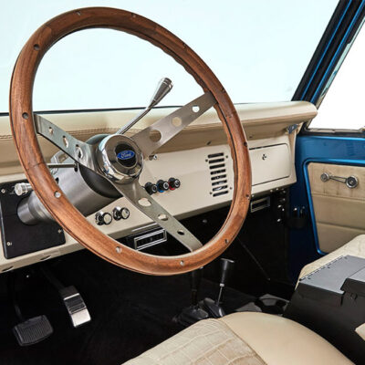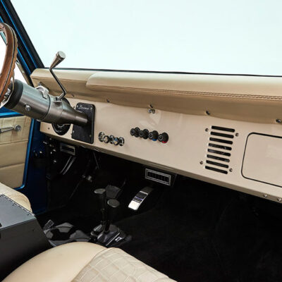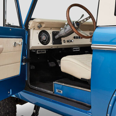This Bronco was bought new by the owner who dated his wife in it back in the 1970’s. After the Bronco was restored, the owners 97 year old father was the first person to drive it. He’s an avid hunter, and an alligator was on his “bucket hunt list”, so the upholstery was done in custom creme ridgeback gator belly as a living piece of taxidermy. This Bronco has the right shade of blue combined with the white top, grill, and interior to give a cool retro but modern look.