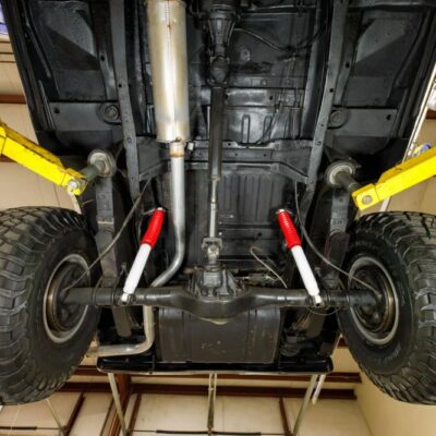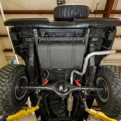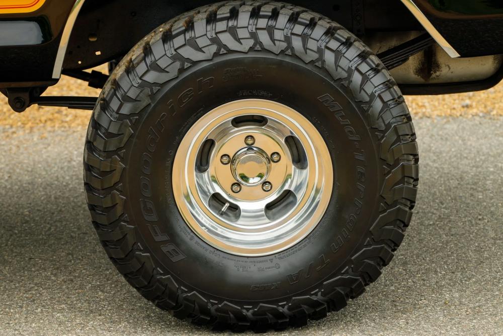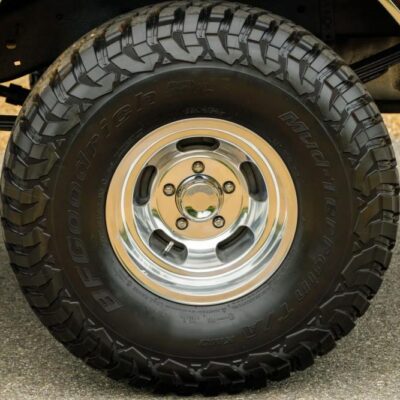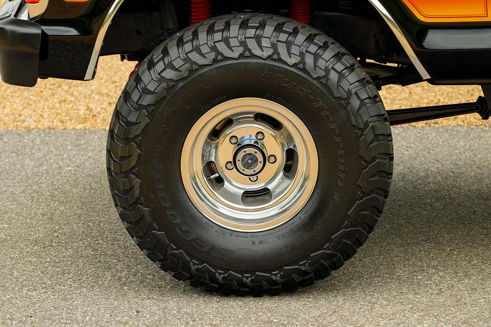 Underneath, the Bronco rides on a 4″ suspension lift, providing both improved clearance and an aggressive stance. It’s fitted with 15″ US Mags slotted aluminum wheels wrapped in 35×12.5″ BFGoodrich All-Terrain T/A KM3 tires. The combination gives classic looks with modern off-road performance.