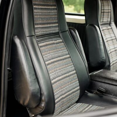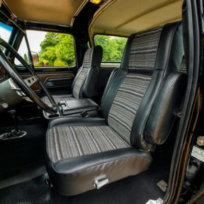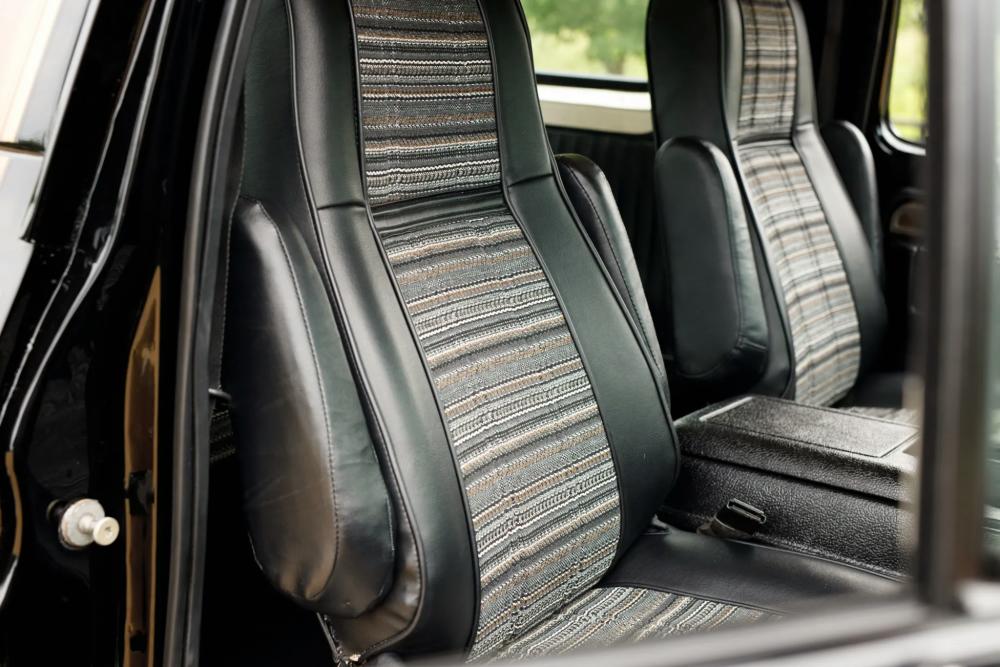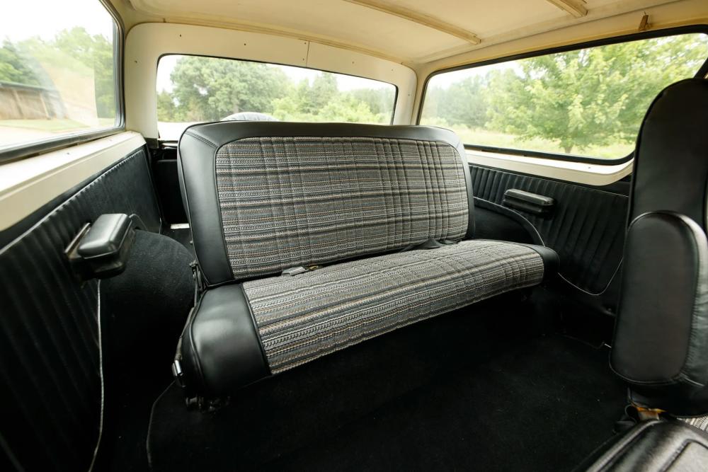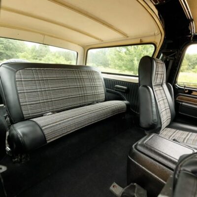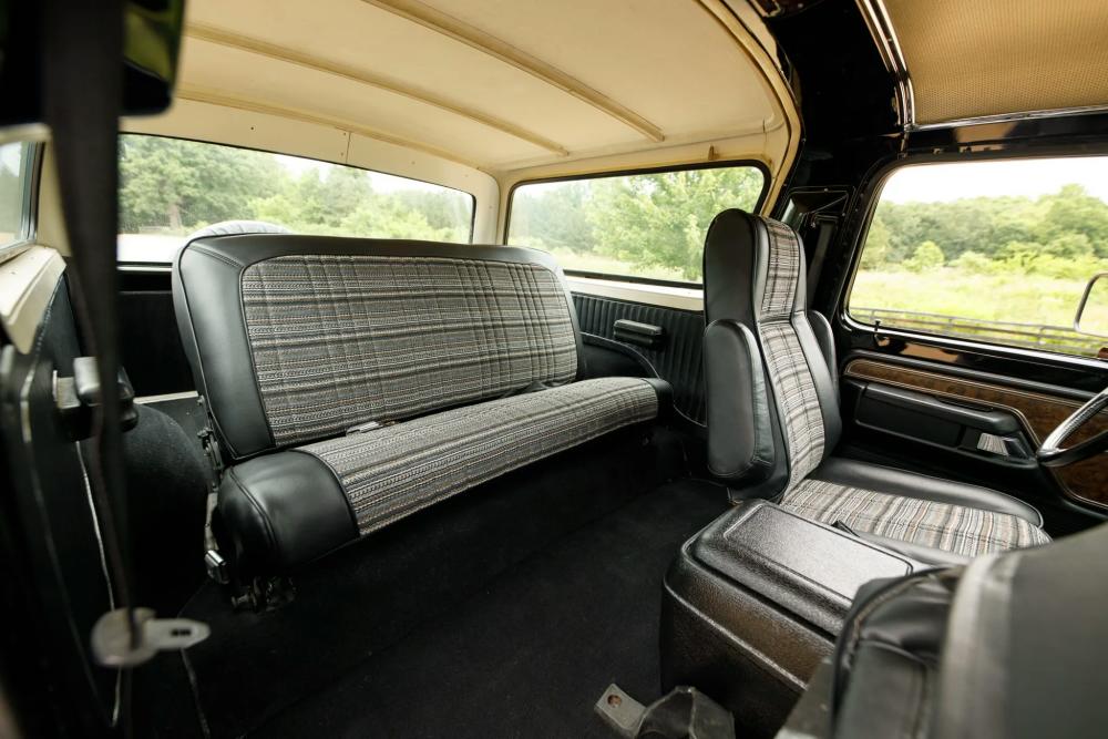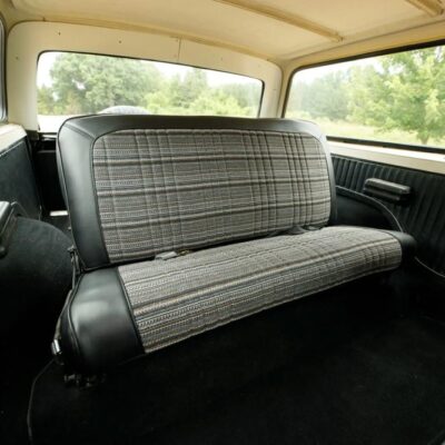 Inside, the cabin has been beautifully restored and upgraded. Front captain’s chairs and a folding rear bench seat are trimmed in black vinyl with patterned cloth inserts, maintaining a period-correct look with fresh materials.