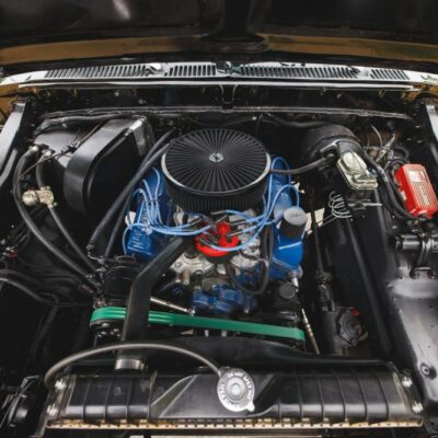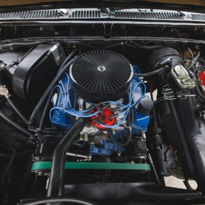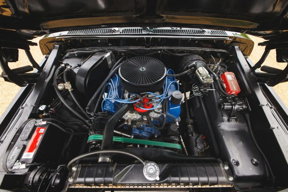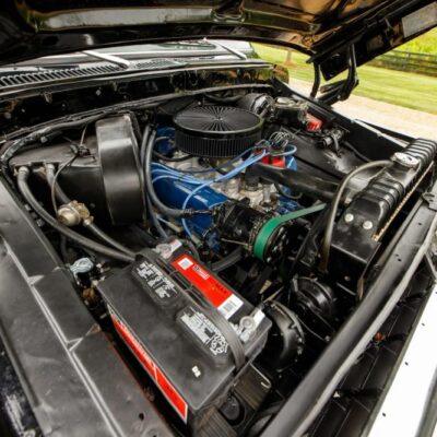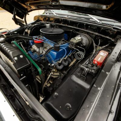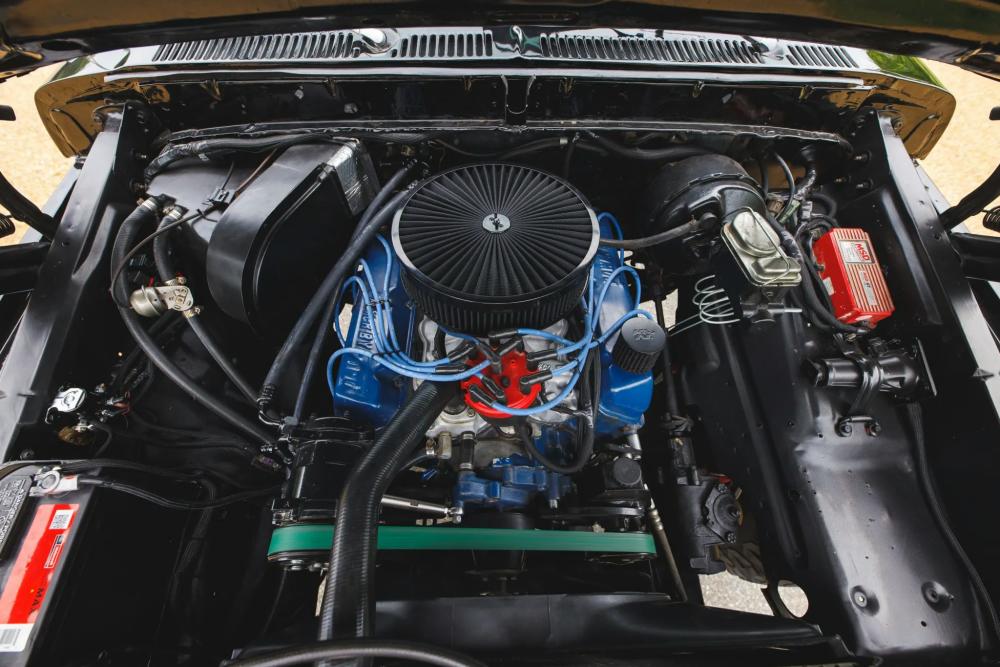 Under the hood lies a replacement 460 ci V8, equipped with a Holley Sniper fuel-injection system for improved reliability and throttle response. A CVF Racing serpentine accessory drive system and tubular exhaust headers further modernize the setup while enhancing performance.