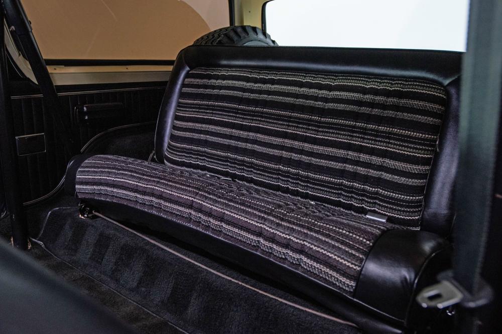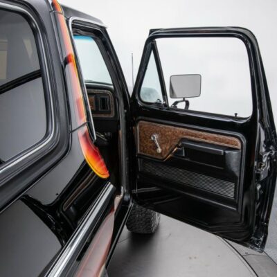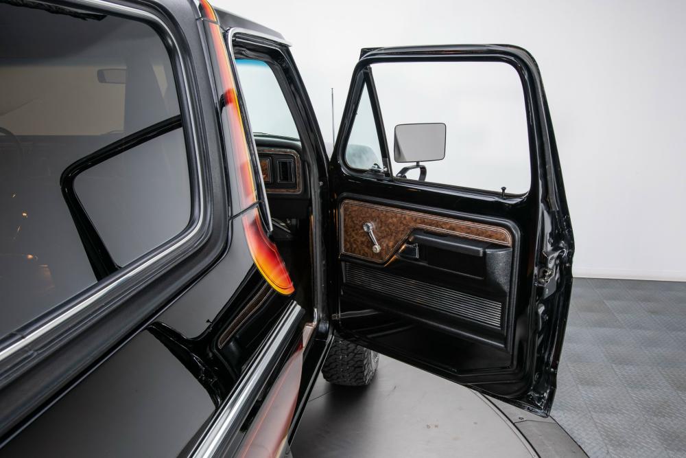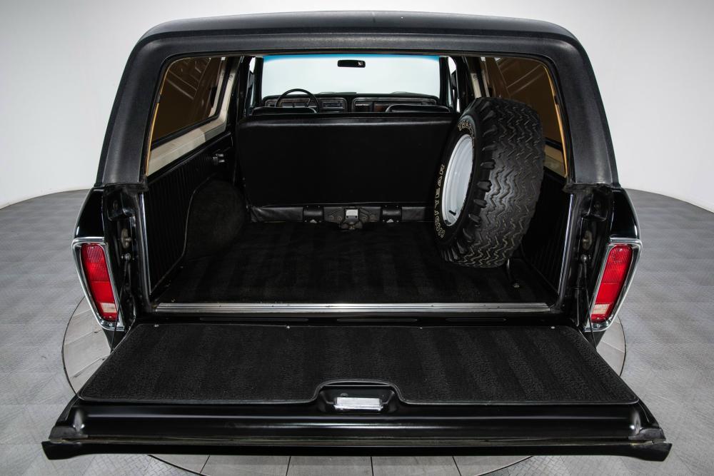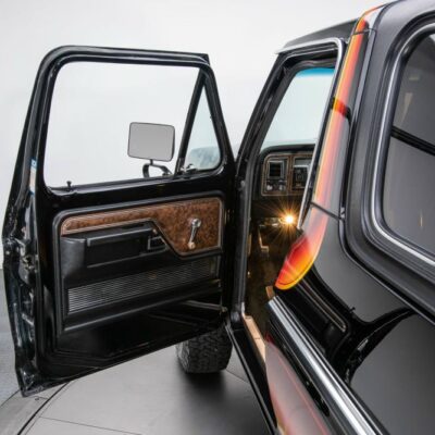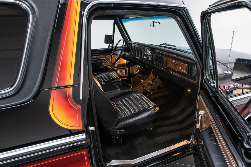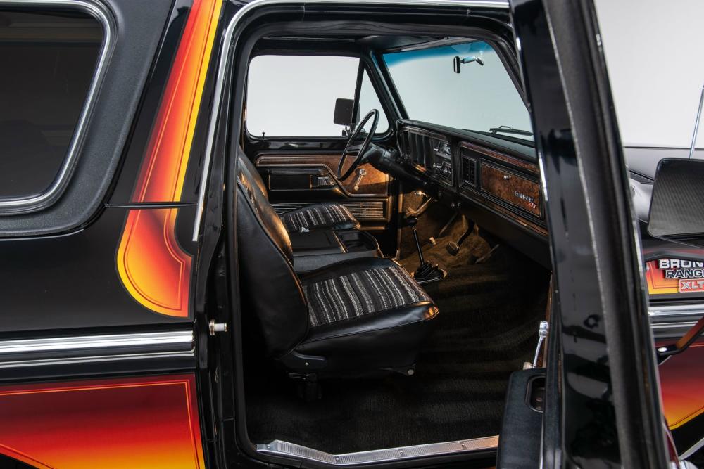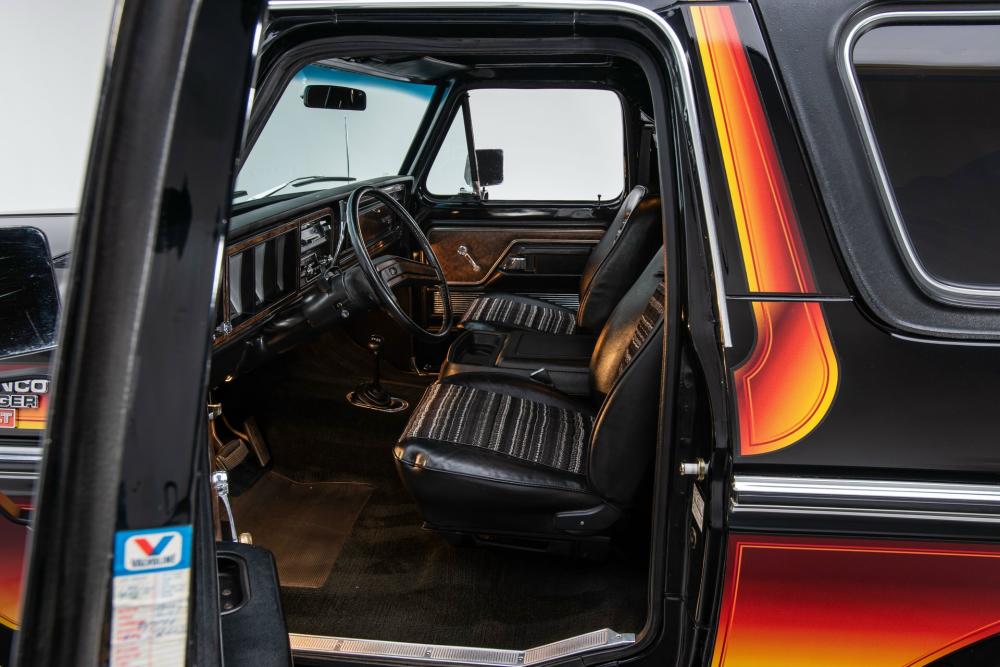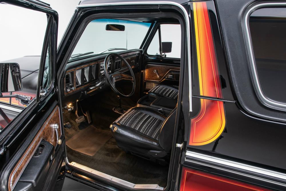 Behind this Bronco’s doors, an attractive cockpit features original, Ranger-spec upholstery that was commonly paired with the Free Wheeling appearance package. Houndstooth bucket seats in the front and rear bench provide enough comfort for you and at least three of your friends. A factory-fresh dash stretches crisp, Ranger-spec wood around clean telemetry, retro AM/FM audio and factory air conditioning. The driver spins a simple, ‘Ford’ branded steering wheel around a polished shifter. Ranger-spec side panels flow all the way to the truck’s hatch. And safety is greatly enhanced by a factory roll bar.