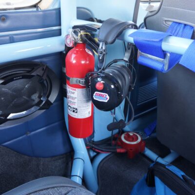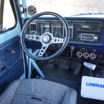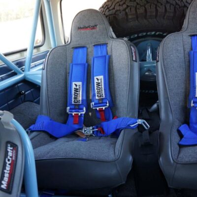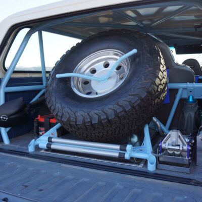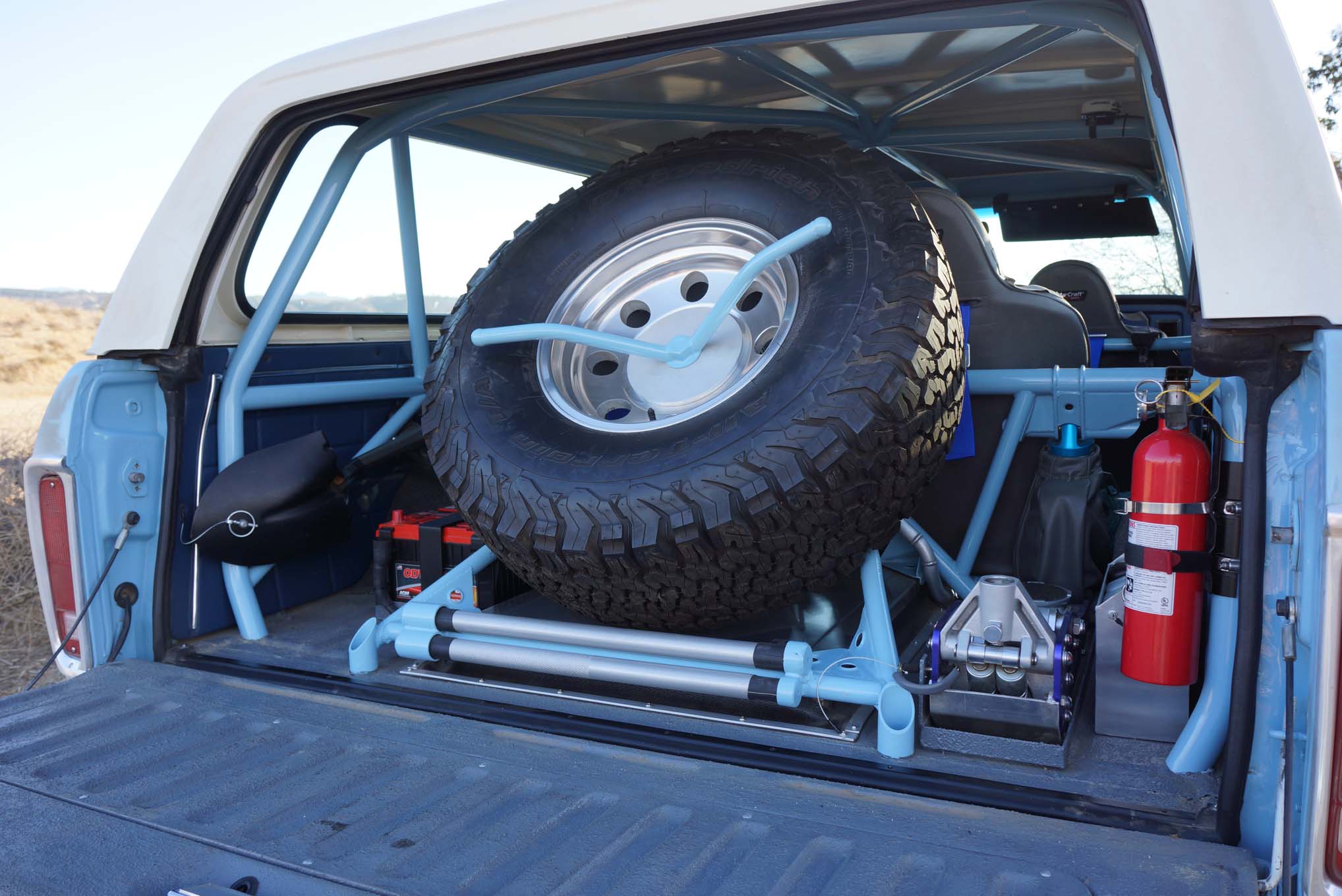 The Bronco has a race-inspired interior. All four MasterCraft Safety seats are mounted to the cage and have five-point Crow Enterprizes harnesses. The entertainment/communications system includes a Sampson Racing Communications head unit with a headset at each seat. The Bronco also includes a Rugged Radios radio for racing and four Sony speakers. An original-design Auto Meter tach was added. Comfort was upgraded with Vintage Air A/C plus custom square-weave carpet and full-length OE-look side panels and headliner by Jesse’s Upholstery in Saticoy, California. Further, the cargo area was Rhino-lined.
