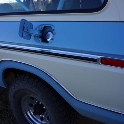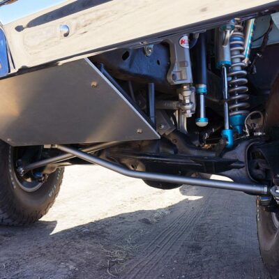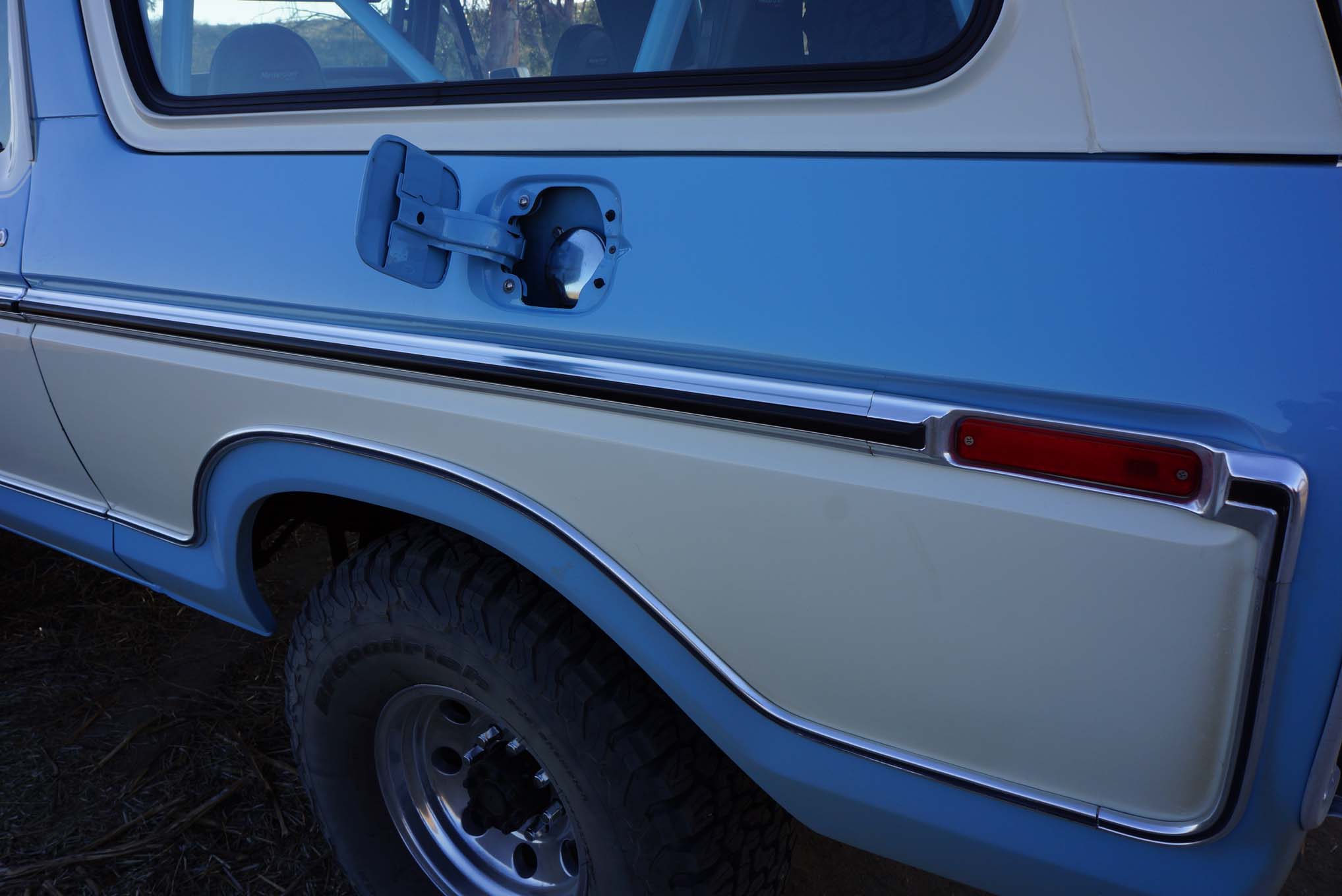 In the front, the factory solid axle Dana 44 was replaced with a Dana 44HD TTB axle that was narrowed to fit the wheelwells. This new setup would not only provide a better ride, but the suspension travel that was required. Both axles were assembled with chromoly shafts by Ventura 4×4 in Ventura, California. Custom-fabbed Roper front radius arms permit full lock-to-lock tire clearance during suspension cycling. The ride is controlled by dual King 2 1/2-inch, 6-inch-travel bodies per side: one triple-bypass and one remote-reservoir coilover. The dual Kings allow the ride to be fine-tuned for the conditions, and King 2-inch air bumps with 4-inches of travel allows the Bronco to absorb the impact when it lands. The front suspension is protected by a custom 3/8-inch aluminum skidplate. In the rear, a 5/16-inch aluminum skid protects the 40-gallon Fuel Safe cell. The original fuel door was moved higher on the quarter panel to meet the fuel cell hose.