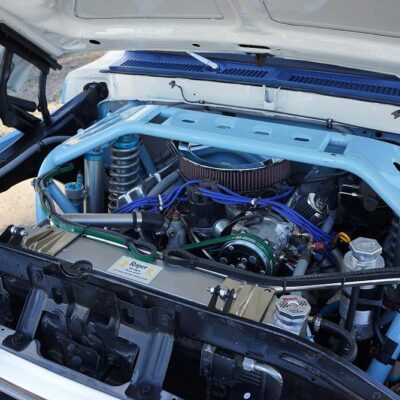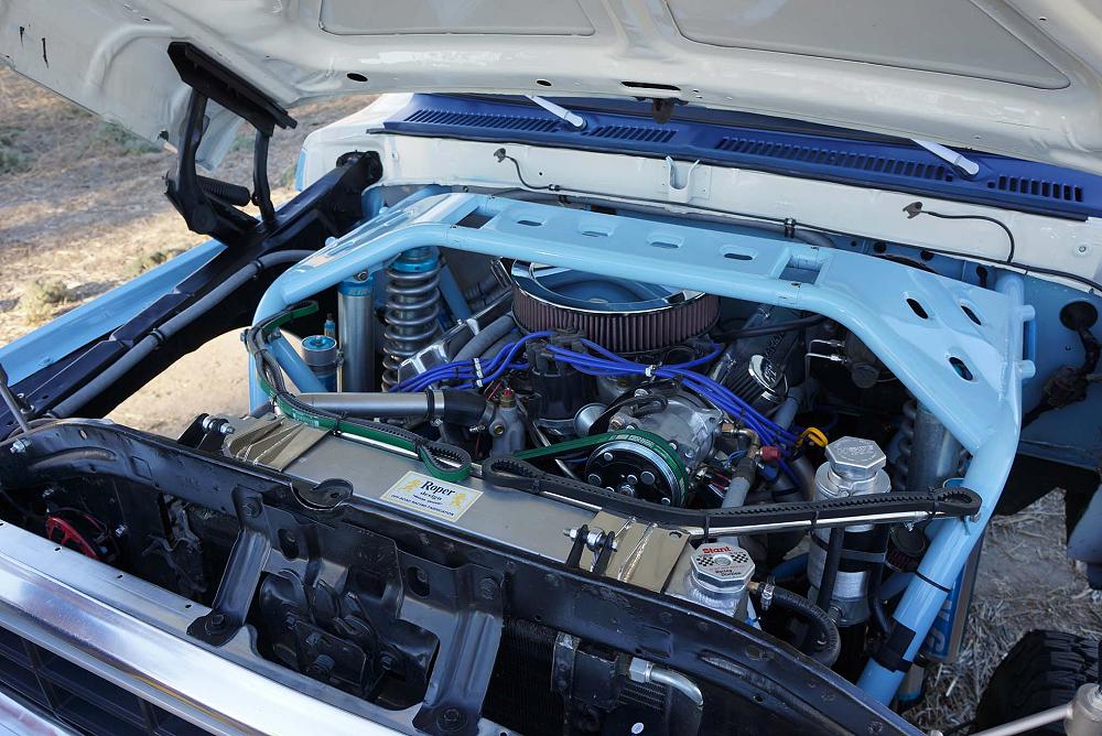 The rest of the geartrain consists of a T-18 four-speed with a period Hurst shifter and an NP205 transfer case that was previously converted to part-time. Custom shafts from DriveshaftPro in Oxnard, California, complete the powertrain.