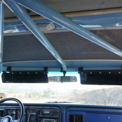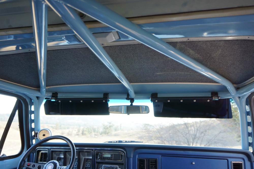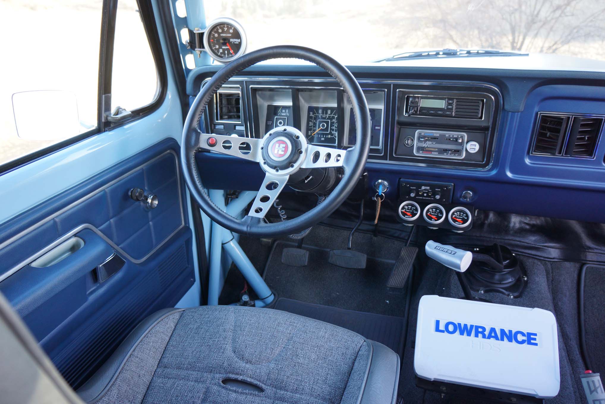 Sean fabricated a Trophy Truck-inspired suspension incorporating factory-based geartrain components. A largely TIG-welded 14-point full cage ties into the frame and also doubles as mounting points for the suspension, seats, and various accessories. At the rear, a later-model Dana 60 with a limited slip and 4.10 gears was narrowed to fit the ’79 body, centering the tires in the wheelwells and avoiding the use of fiberglass quarter panels. Roper Design used custom 3-inch lift Deaver leaf springs and custom 2-inch drop shackles to mount the axle to the vehicle. King quad-bypass 16-inch travel shocks with 3-inch bodies were run through the cargo area behind the rear seats and then mounted to the cage.