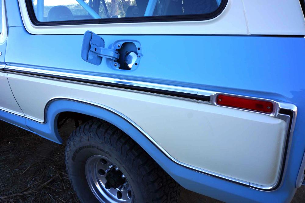 The final piece of the puzzle was the body. Roper Design did the basic metalwork, then Chemo Ordaz did the finishing details. Painter Rickey Hodge reapplied the original colors to the Bronco: Ford Wimbledon White and Light Medium Blue. To minimize glare, the hood received a race-inspired, flat-blue patch that also matches the interior panels. Final details include a custom Roper rear bumper with signature oval dimple-die swiss-cheesing. The bumpers were chromed by Meclec Metal Finishing in Fresno, California, and the stock front bumper has a custom lightbar for four LED KC Daylighters.