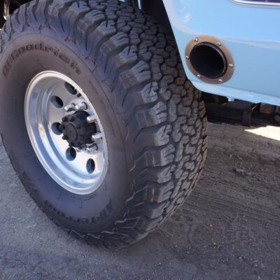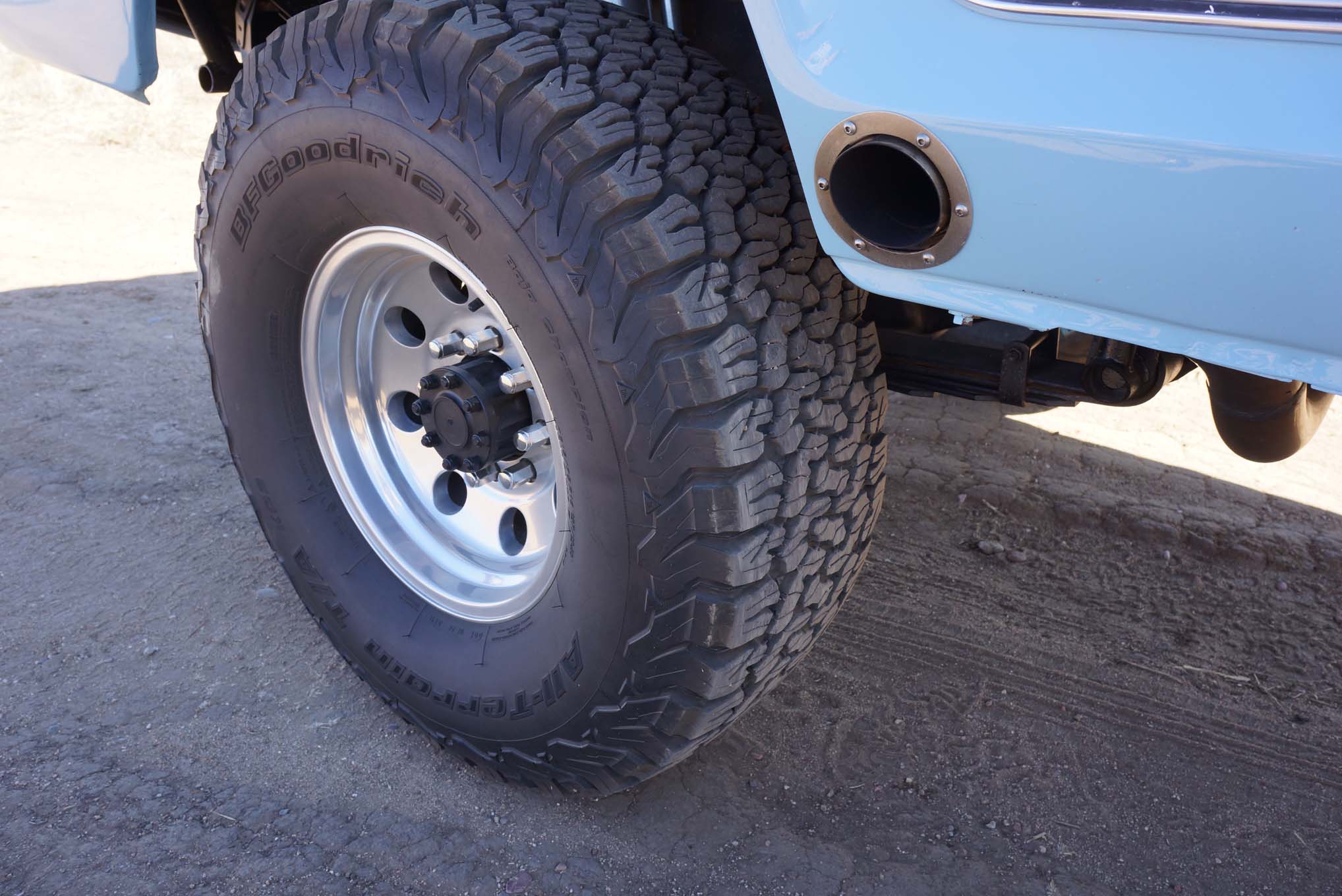LT315/75R16 BFGoodrich KO2s were chosen for their street and off-road performance. They are mounted on eight-lug 16×8 Alcoas for a period-correct look. The rolling stock is controlled by a Howe box, pump, and ram-assist. Roper Design made a custom pitman arm and swing-set steering linkage.