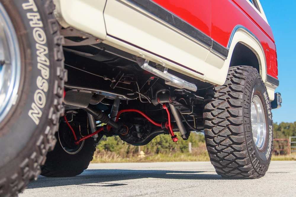 The windshield banner suggests that that Bronco has a Rough Country suspension kit, but I’m not so sure that’s entirely true. If you look at the photo above you can see that the Ford Bronco has red extended radius running from the front axle to just under the door. I’ve never known of Rough Country making extended radius arms for the Ford Bronco or F-150. Of the suspension companies that did, the ones in the photo look like the ones offered by Rancho.