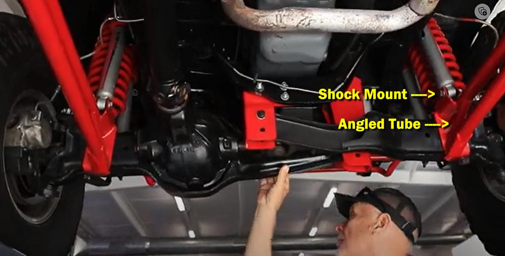 Wanting to get a better look, I found a video of this Bronco for sale on YouTube. If you watch the video, you’ll be able to see the suspension when they have the Bronco on a lift. Notice in the photo above that the radius arm has a shock mount on top of the arm and an angled tube below it. Below is a screen shot from the video showing those same exact features.
