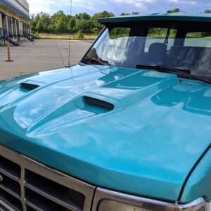 The aftermarket fiberglass hood with dual scoops combined with the dually fenders adds to the trucks aggressive look.