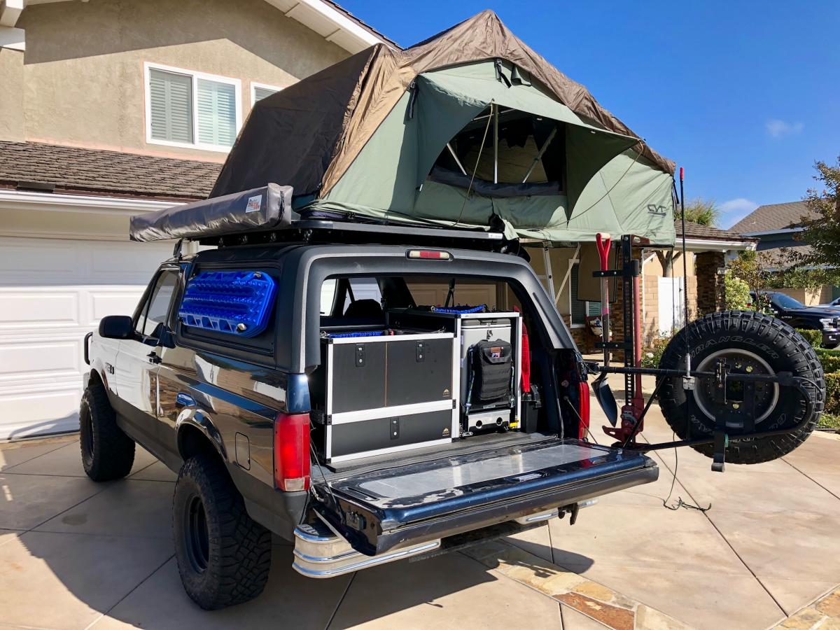 There’s definitely advantages to the fullsize Bronco. It has a wider stance and stronger drivetrain than a midsize SUV, a shorter wheelbase than a fullsize truck, and the added ability to access the rear without leaving the vehicle. That wide stance also helps the vehicles stability when you add the weight of a roof top tent, and other gear to the roof.