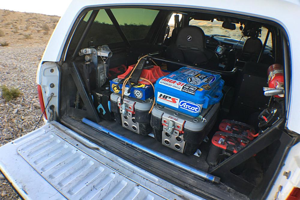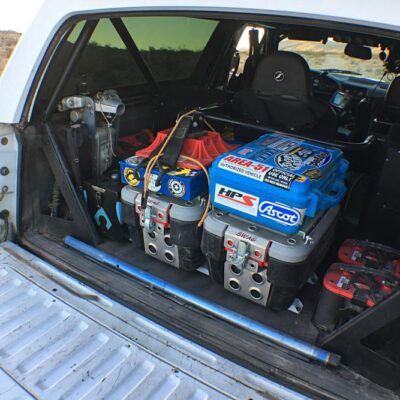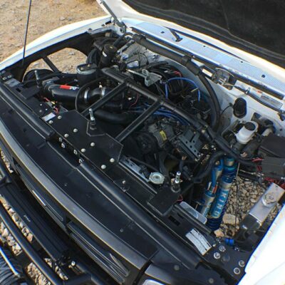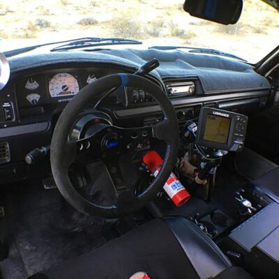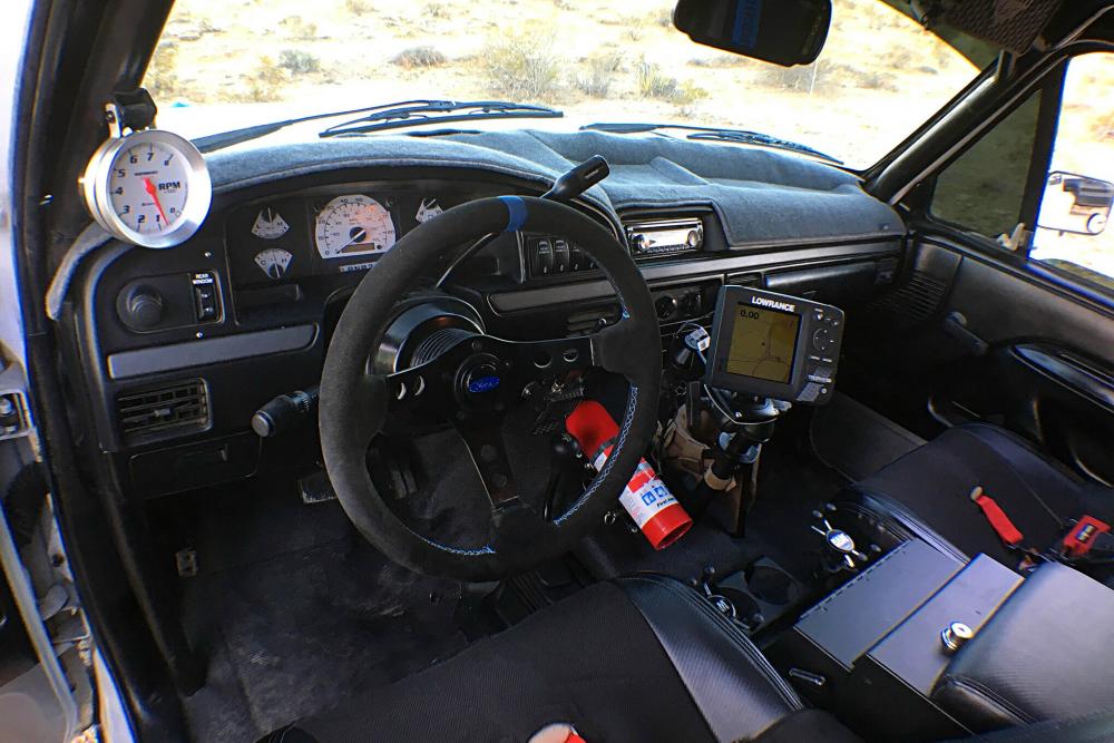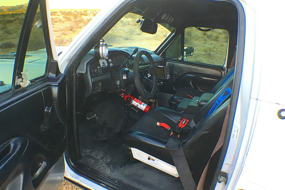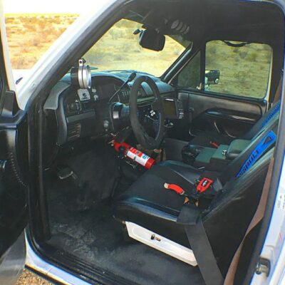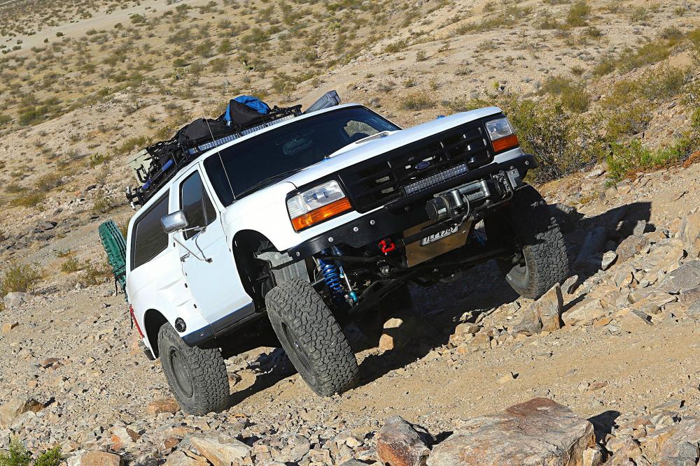 The Bronco still looks like a Bronco, only better. The stock Ford body has been enhanced with a McNeil Racing fiberglass hood and front fenders as well as bedsides. With the long-travel suspension, they give the wheels plenty of room to articulate. The entire thing has been painted white so the hot desert sun won’t be a problem. When that sun goes down, there are twin Lifetime LED lightbars to provide plenty of artificial light.