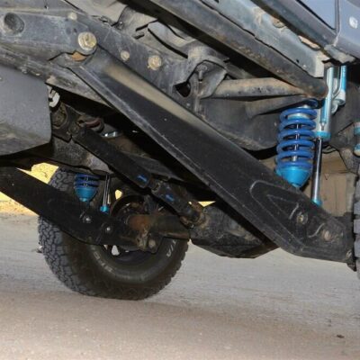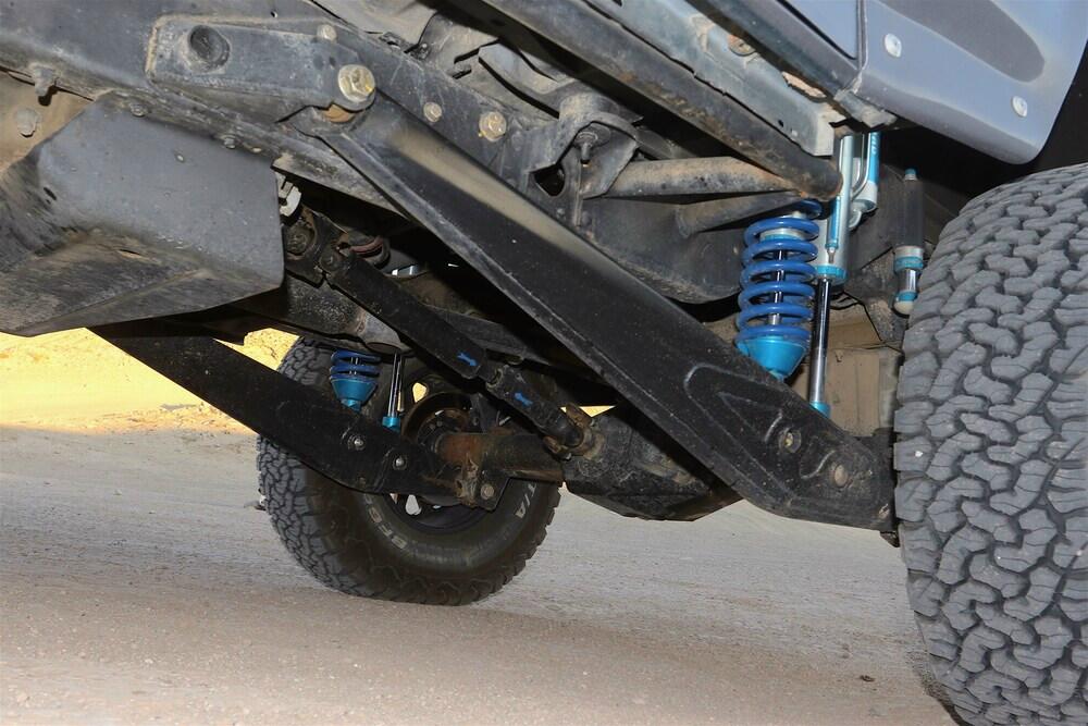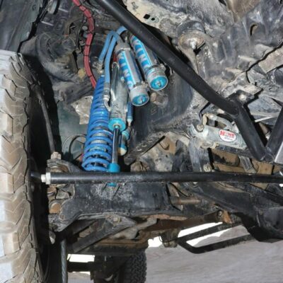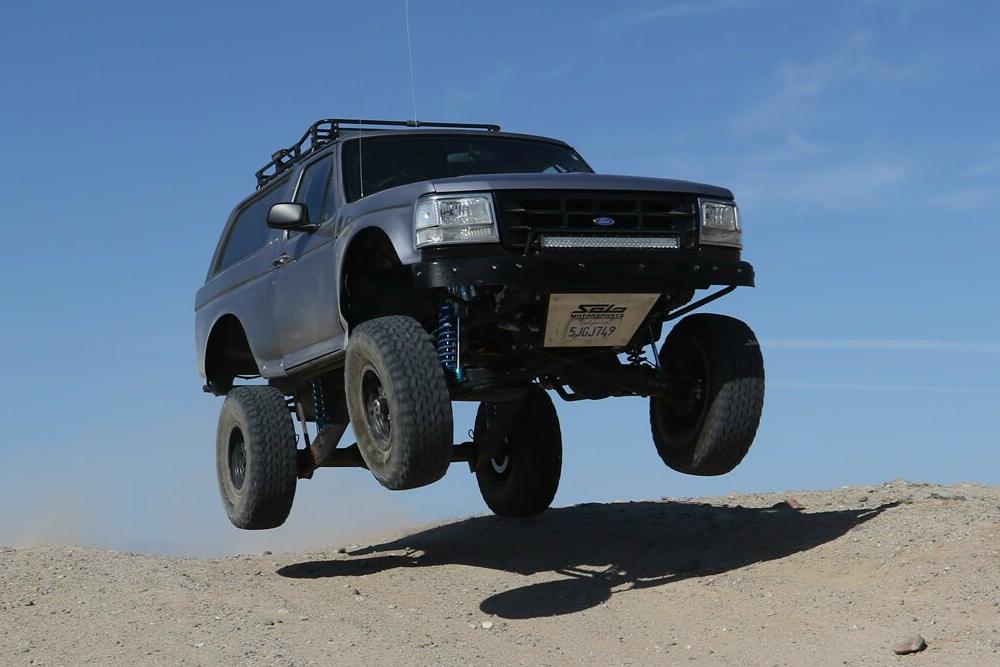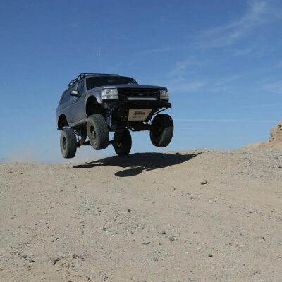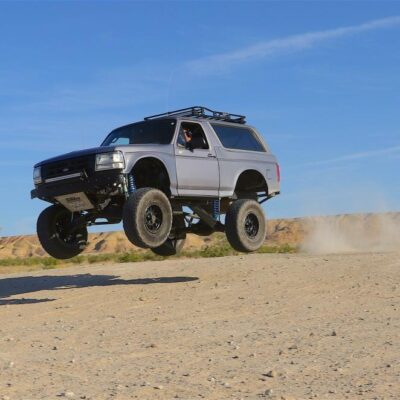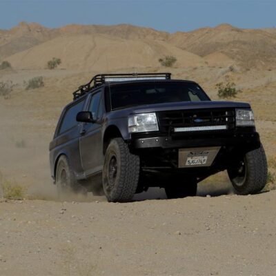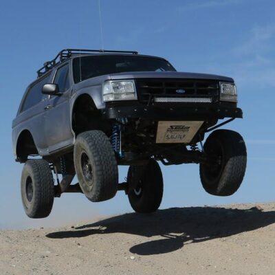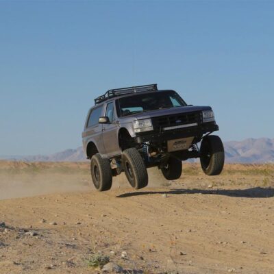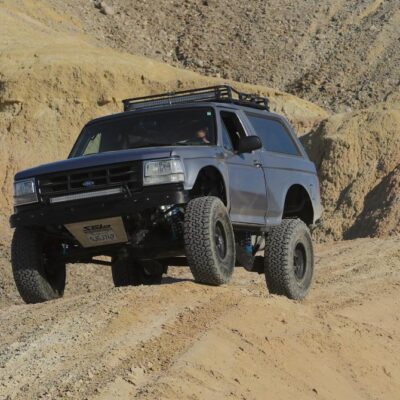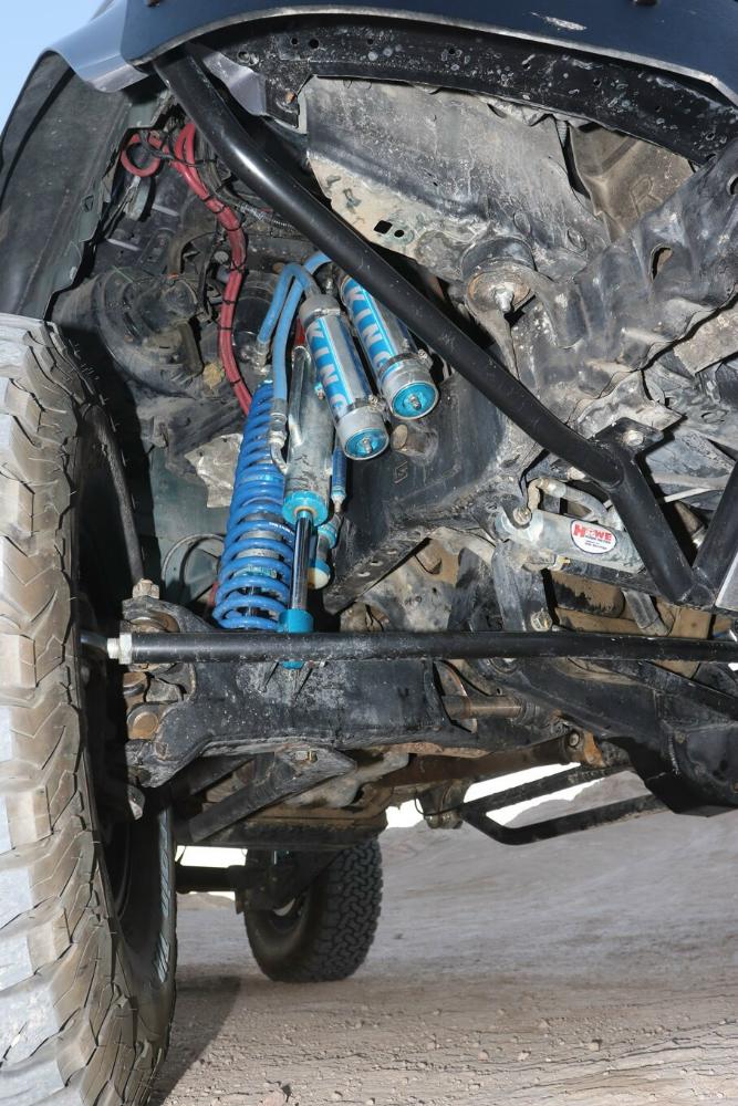 The Bronco has plenty of suspension travel. Utilizing a Solo Motorsports Stage 6 ‘Trophy’ long travel front-end kit that has cut, turned, and extended the system that’s now 9 inches wider (4.5 inch per side) than stock. A Howe Performance steering system gets the front end to turn properly, while this system features a pair of King shocks per side. The Kings are what is fast becoming the “usual setup” for any high-performance off-road vehicle: a reservoir-equipped 2.5 coilover and a multi-bypass shock. Front wheel travel is around 19 inches of pure bliss.