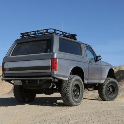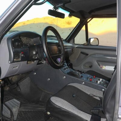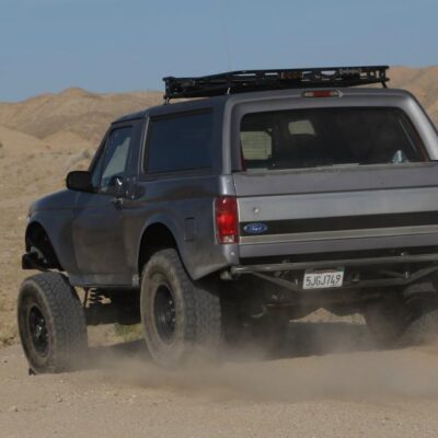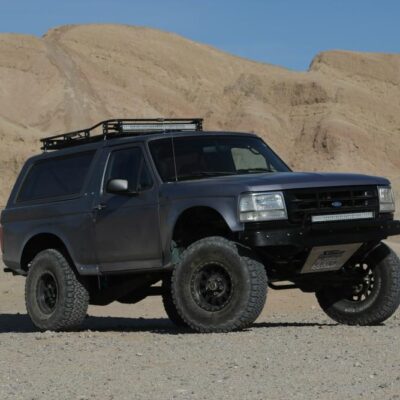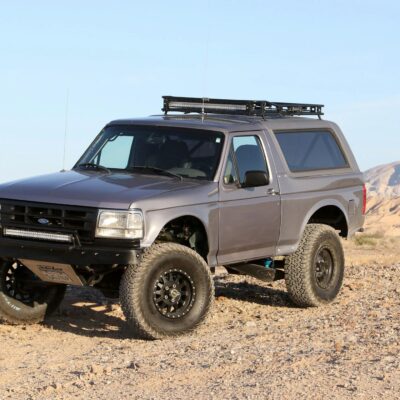 Solo Motorsports is a one-stop shop when it comes to building a Bronco that has it all. They, of course, did the suspension, but they also build the full cage as well as the steel bumpers and roof rack. They did the fiberglass fenders as well, and had a local shop apply the gray exterior paintjob.