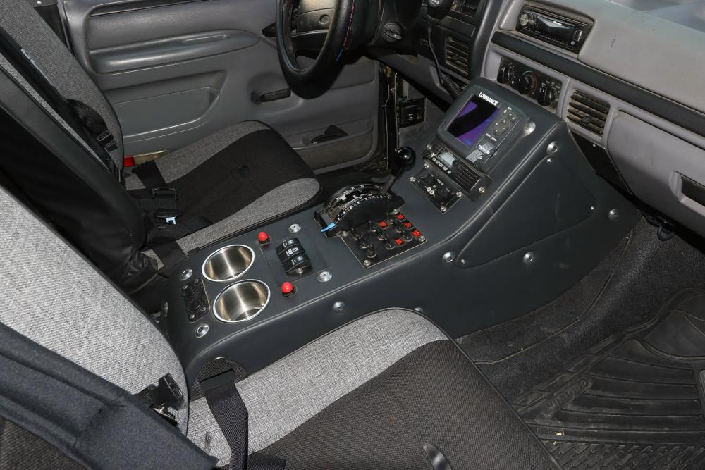 Speaking of the rack and bumpers, Solo used a host of GG Lighting lightbars to keep the wilds at bay even on the darkest desert night. The interior is capable and comfortable even with the full rollcage, taking up quite a bit of the available space. Much of it was left stock, but there are PRP seats to encase the occupants, and PRP harnesses keeps to keep them safely in place. A custom, Solo-produced center console houses an Art Carr shifter and other items, such as a Lowrance GPS unit and the Kenwood/Rugged Radios communication systems. A switch panel controls the various electrical things, and there’s even a pair of cupholders!