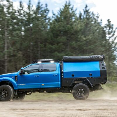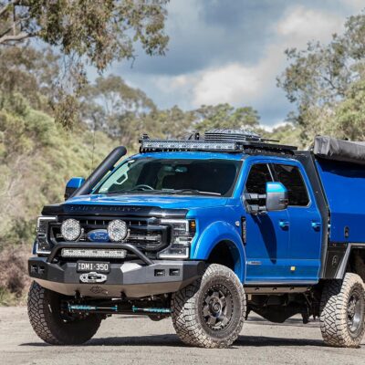 This 2021 Velocity Blue Ford F350 Lariat Tremor was built to be able to travel anywhere in comfort and tow a Bushtracker caravan (camper).