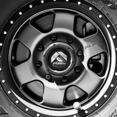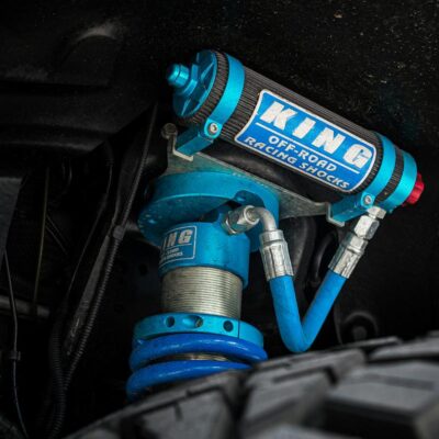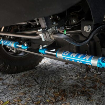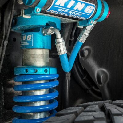 Suspension wise, the installation of King coil-over shocks provides a four-inch lift in the front, and lift blocks raise the rear. The rear also benefited from a set of King shock-absorbers. A pair of King steering dampers help keep the 37×12.50×18 Nitto Grapplers mounted on Fuel wheels steering straight.