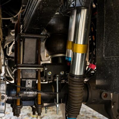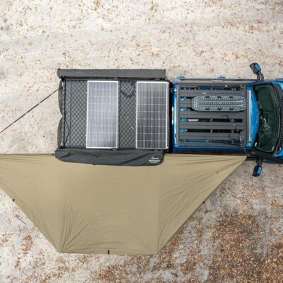 A Bush Company XT 270-degree awning fitted to the passenger side and a Bush Company 180-degree awning on the driver’s side provide shelter from the elements.