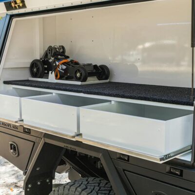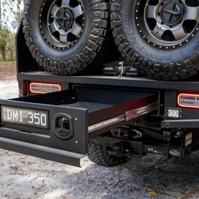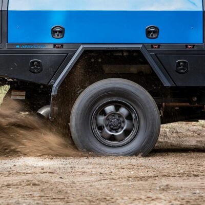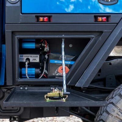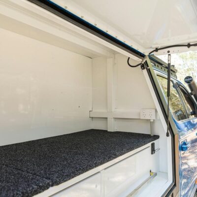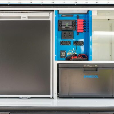 There’s also a slide-out kitchen with built-in pantry, internal slide-out drawer system on the driver’s side, a 140L Dometic upright fridge and an additional 40L Evakool drawer fridge secured to the passenger’s side. In the passenger-side toolbox, you’ll find an ARB twin compressor with 20L air tank, vital for pumping those meaty 37s back up to road pressures.