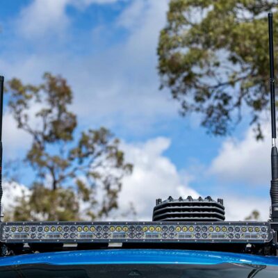 On the front AMVE alloy bumper are a pair of Australian-made Ultra Vision Nitro 180 Maxx LED driving lights, which also feature a handy high/low function to adjust the lights for the terrain. In addition to the driving lights, a 30-inch Ultra Vision LED lightbar is mounted to the bar as well as a 45-inch Ultra Vision LED light bar mounted to the Rhino-Rack roof platform. Four Stedi fog lights have been bolted in the recess of the front bar, and the headlights have been upgraded to Maritimo XB LED units, rounding out a very complete lighting package.