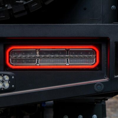 In order to light up the campsite or work area at night, Ignite LED work lights were mounted above the rear wheels and Ultra Vision Atom flush-mounted LED lights along with four Ultra Vision LED work lights were mounted in the roof rack.