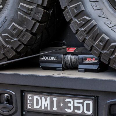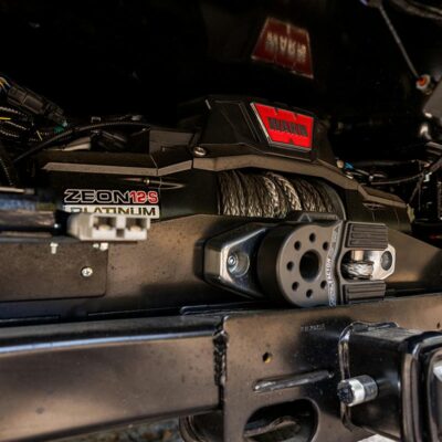 A Warn 12-S 12,000lb winch is mounted at the front and rear of the truck, and a Warn 35-S 3,500lb winch is mounted on the canopy to winch the dual 37-inch spare tires up into there storage locations.