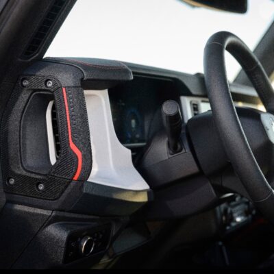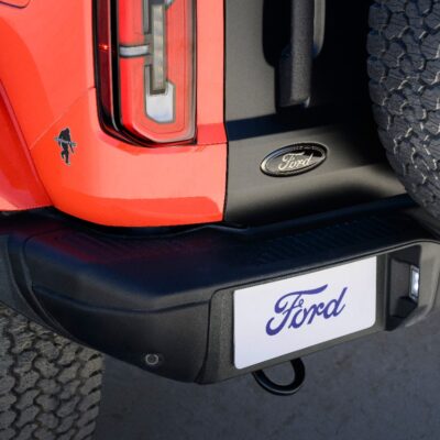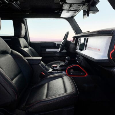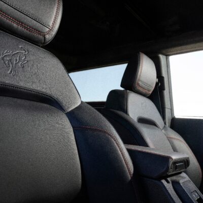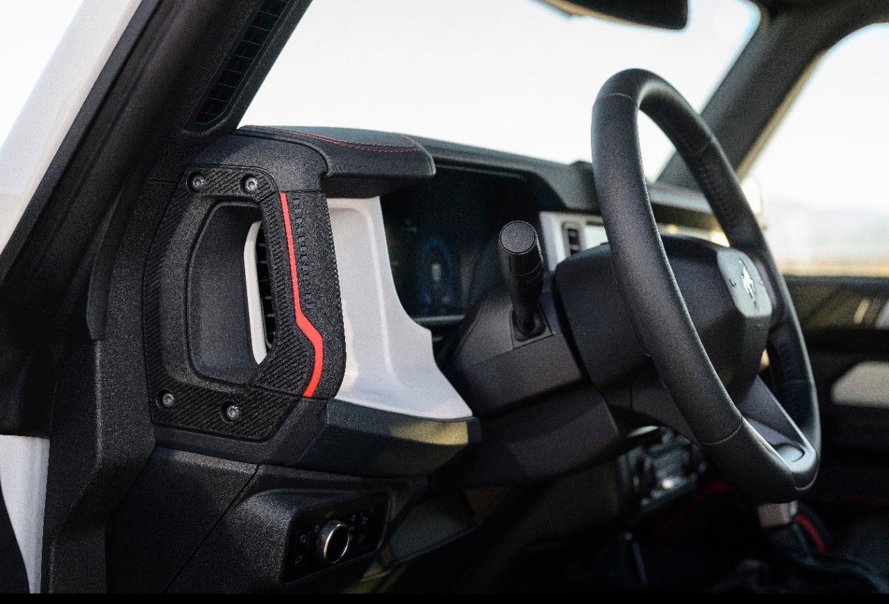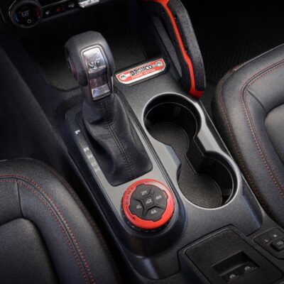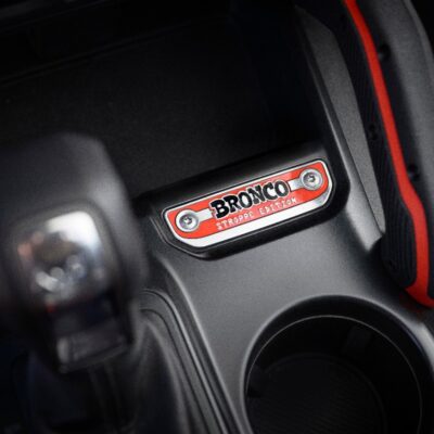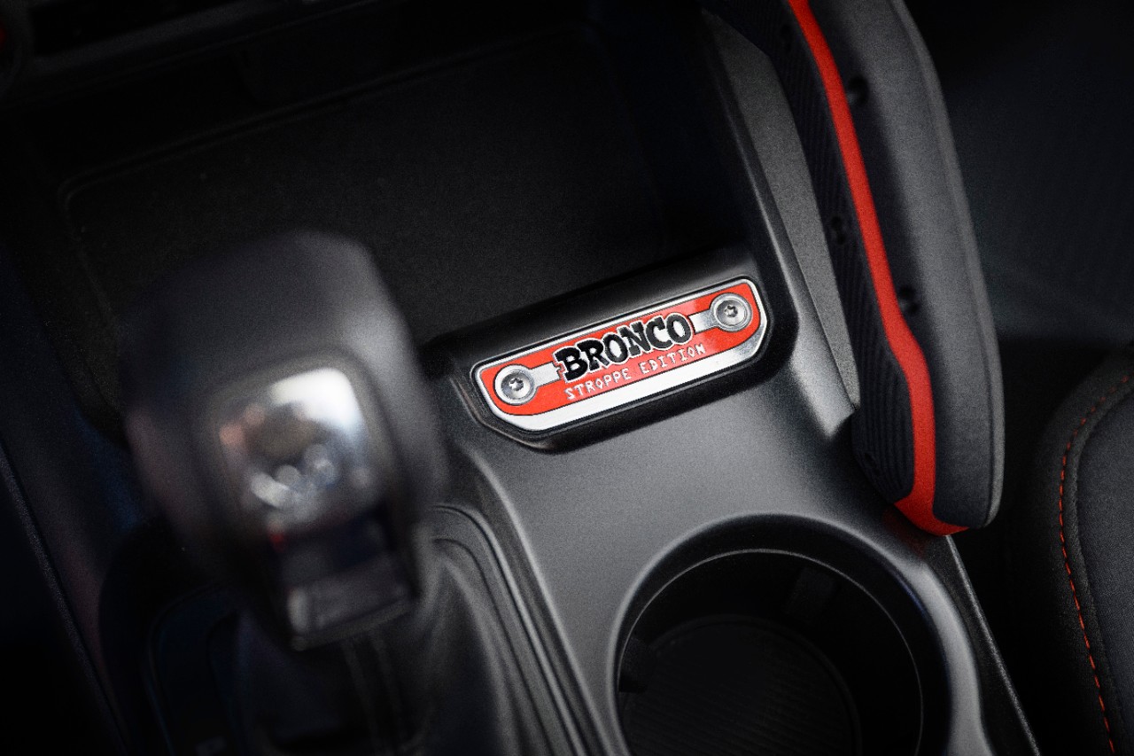 Bronco Stroppe Special Edition stands out with a white instrument mid-panel, first introduced on the Bronco Heritage, but adds Code Orange accents throughout the cabin. That includes the “Bronco” wordmark on the dash, the bezel of the G.O.A.T. mode dial, the insides of the grab handles, and in the contrast stitching on the dash topper and seats. The center console also adds a unique Stroppe Special Edition badge.
