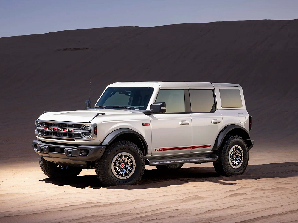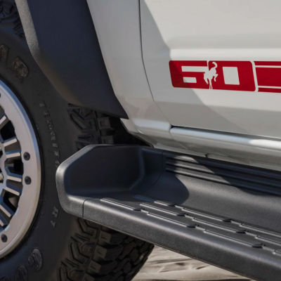 • A bespoke grille painted in Warm Alloy, inspired by the original 1966 Bronco, featuring bold Vermilion Red “BRONCO” lettering.