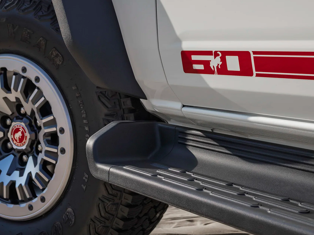 • 17″ Gravity Gray alloy wheels wrapped in 35″ Goodyear all-terrain tires. Center caps in Vermilion Red, showcasing the Bucking Bronco logo and “1966”—a nod to the first model year.
