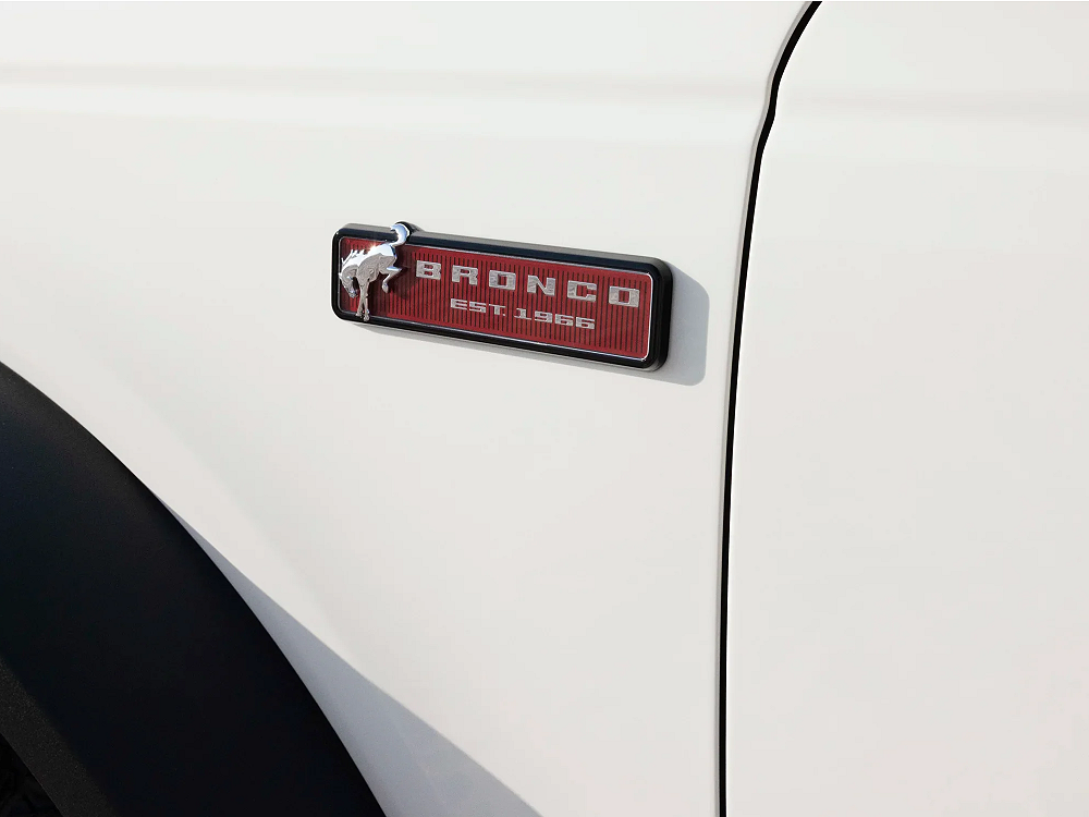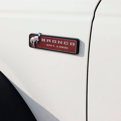 • A Wimbledon White hard-center spare tire cover with bold Vermilion Red “Bronco” script and a sleek, matte-black Ford oval badge on the tailgate.