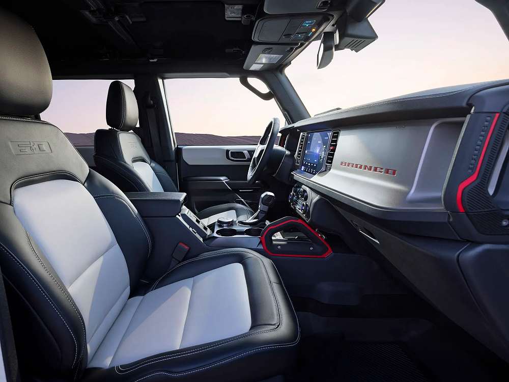 • Trim & Stitching: Marine-grade Alpine vinyl on armrests, Alpine stitching across the leather dash, and Bronco Red accents brighten up the instrument panel and grab handles.