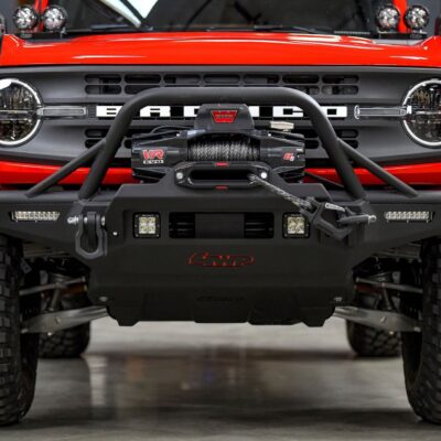 The first of the 4WP custom Bronco builds is a 4-door Black Diamond series SUV features a mix of 4 Wheel Parts Factory brand parts including a full width front bumper, with options for a skid plate and winch platform. Additional accessories include: rock sliders, rear bumper and tire relocation bracket, fender deleted, plus a Smittybilt Hard Shell Roof Top Tent and camping gear, and refrigerator/air system. It rides on 37-inch BFGoodrich® KM3 Mud Terrain tires mounted to 17-inch Method Race Wheels.