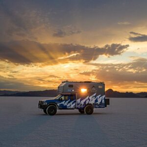On the back, they have a 1Up bike rack and a custom ladder to access the roof where the spare tire, gear box, and (3) 175 watt solar panels are mounted. There’s an awning that extends over the right side of the vehicle as well as area lighting so they can easily set up base camp outside.