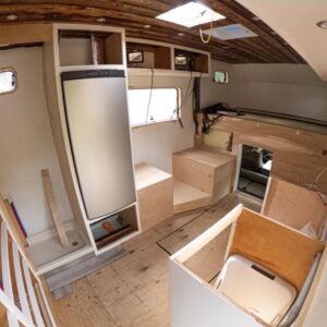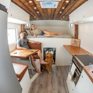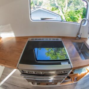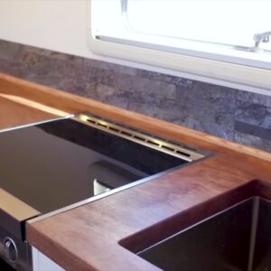 They have a stainless steel sink mounted into the raw slab counter and next to that is a Dometic 3-burner stove and oven. Having the oven has been great for meals on the road and treating themselves to some of Ashley’s baked goods.
