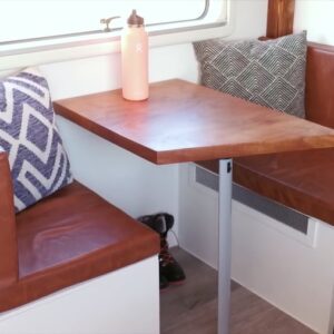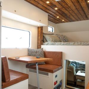 He has a sound bar installed over a 32″ 4K monitor that makes editing and watching movies in bed a breeze. On the opposite side of the rig is two benches and a custom sycamore table for eating and working at.