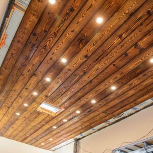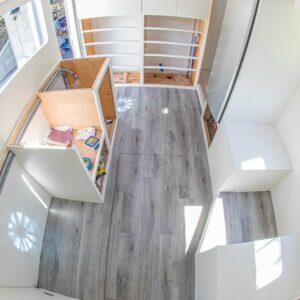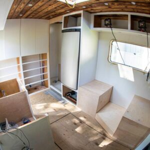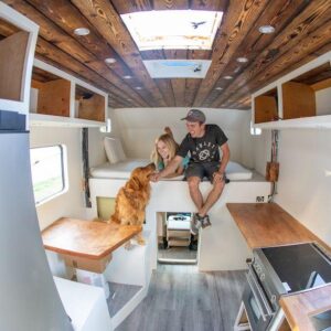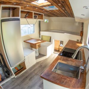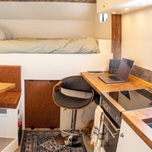 Andrew knew the layout he wanted from past experiences of living in vehicles. An editing bay is a huge must have due to the countless hours he spends behind the computer. His desk spaces is made out of the custom sycamore raw slab counter that he installed from Red Point Woodworks.