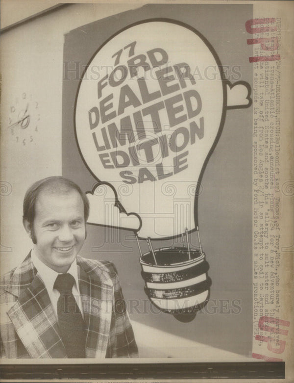 Mich., launched the flight from the Santa Anita Race Track Infield at 3:15 a.m. PST Tuesday, hoping to reach Florida within 12 days. He is attempting to break the standing cross-country hot-air balloon record of31 days set several years ago. Thomas’ zig-zag course over Phoenix. Roswell, N.M., Dallas, Tex. and Jackson, Miss, is being followed on the ground by an 18-man chase crew supplied by the Ford Motor Co., sponsor of the attempt. Thomas was nearly killed last summer when he tried to be the first person to cross the Atlantic Ocean alone in a balloon. His balloon was torn apart by a violent storm about 800 miles out and he spent four days in a life raft before he was rescued by a Russian trawler. His five-foot by five-foot wicker basket carries little food or survival gear, but he is equipped with a two-way radio and a CB unit to talk with other CB’ers as he crosses the country. His handle is “Lightbulb.”
